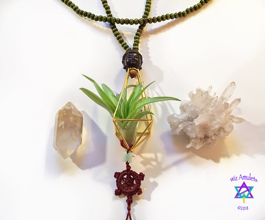 24K Gold Merkaba Air Plant Terrarium Monk Necklace ~ Buddha Prayer Rudraksha Beads
