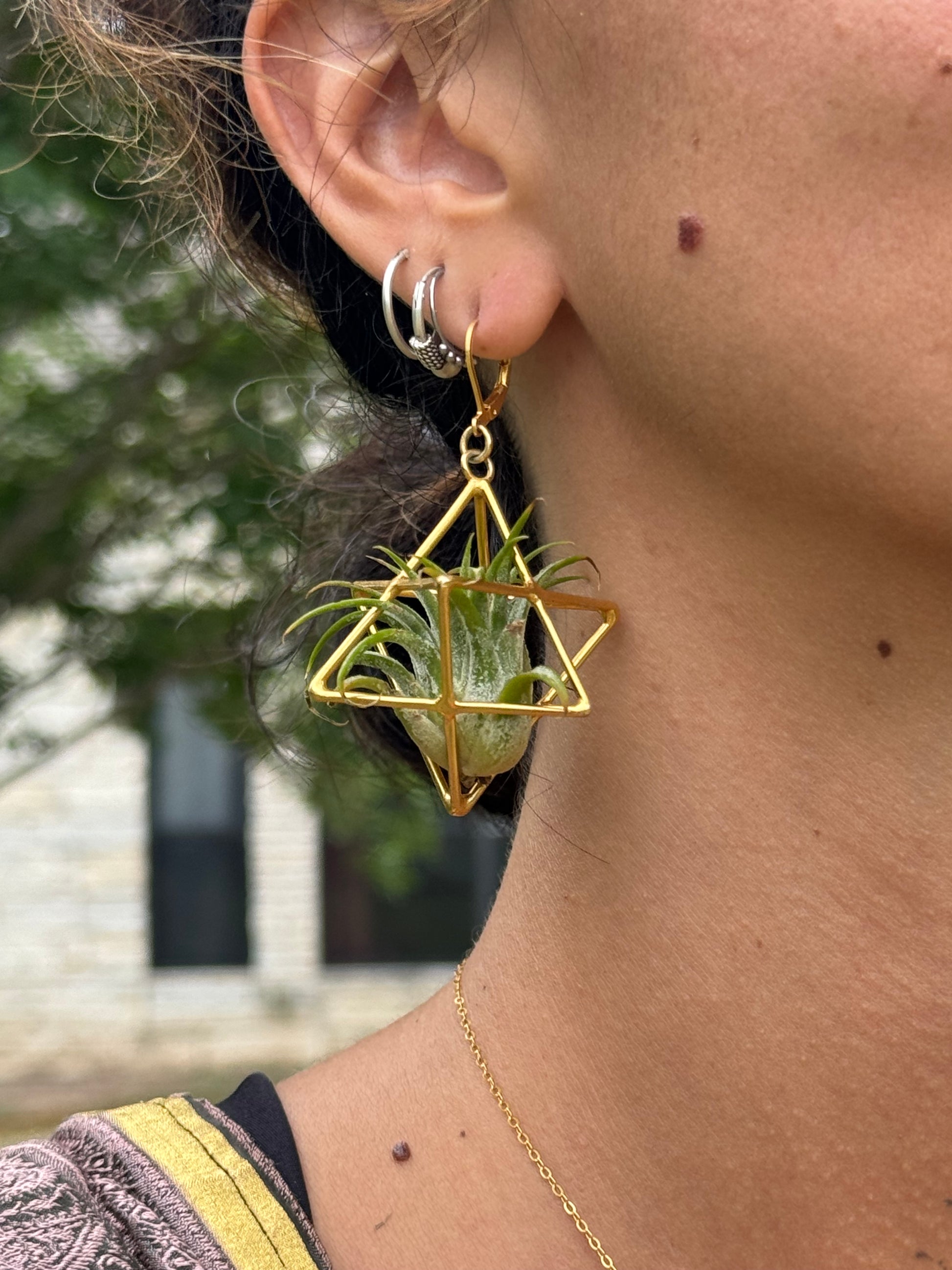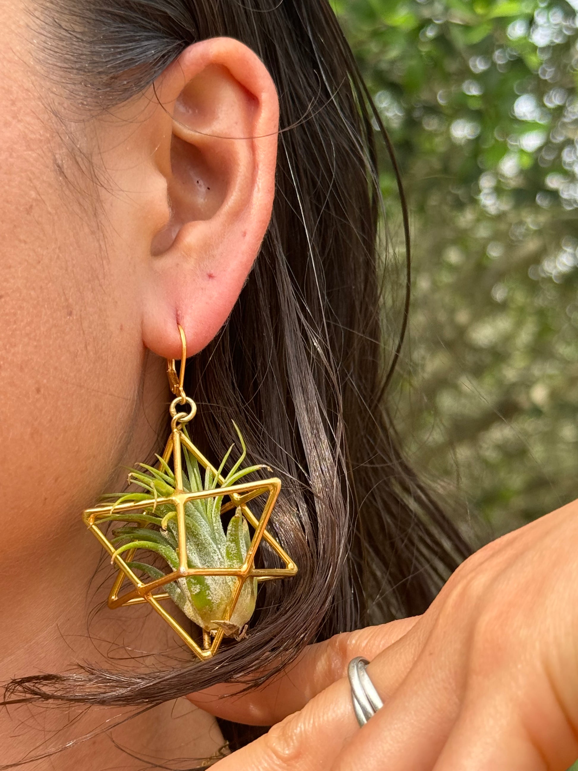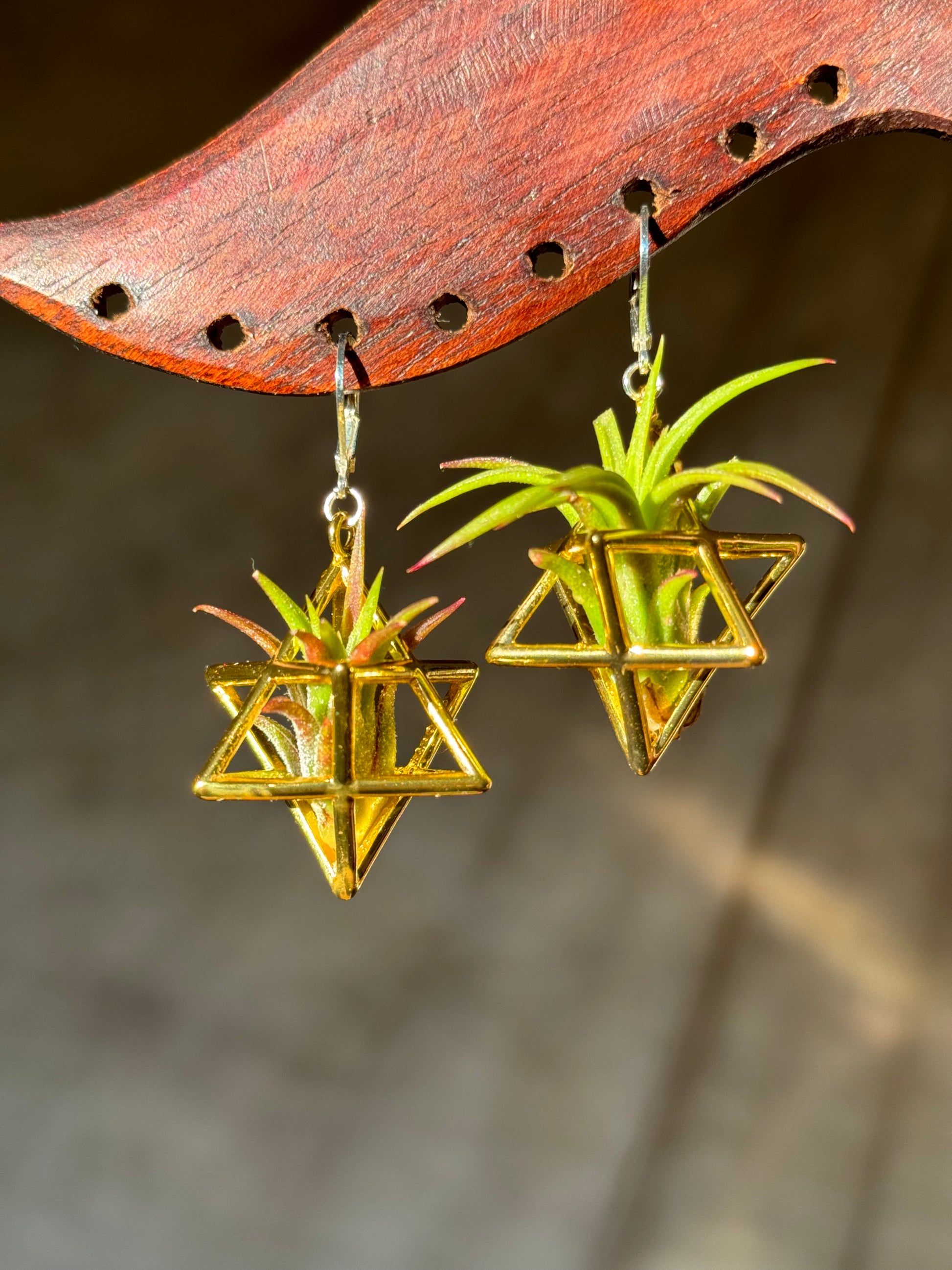 24K Gold Living Air Plants Charge and Meditate in their MerKaBa (Rotating Body of Light) Sacred Geometry Temple Earrings ~ The 3D shape gently cradles and secures the interchangeable air plant. Style that brings Fresh Air and Great Energy✨