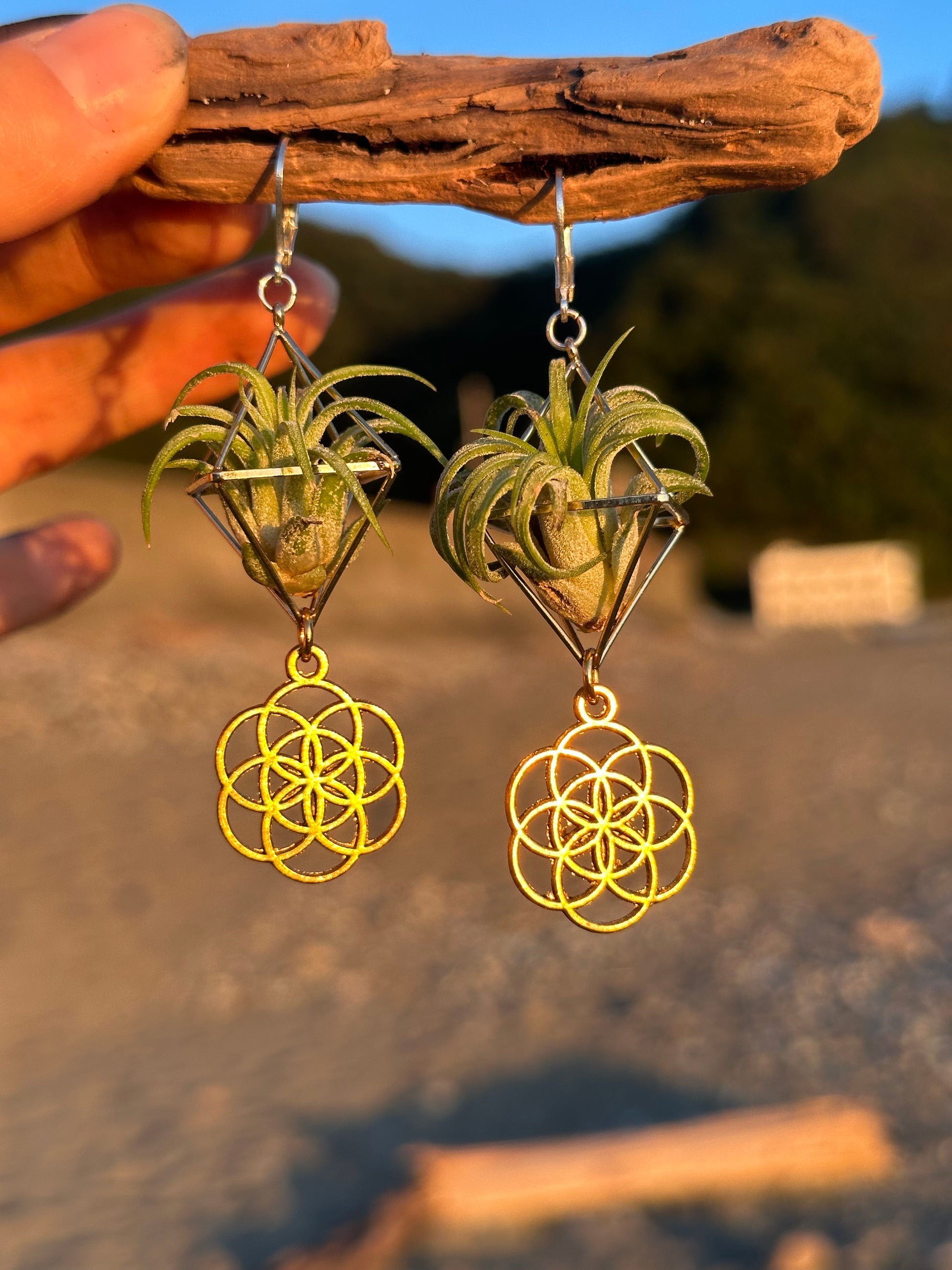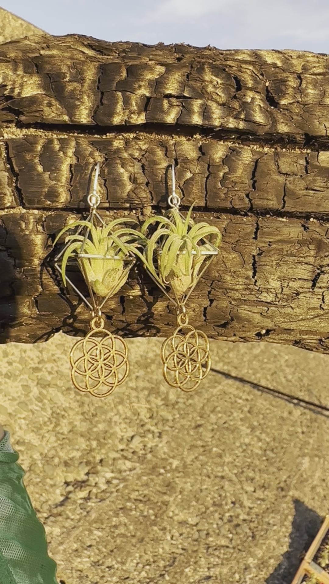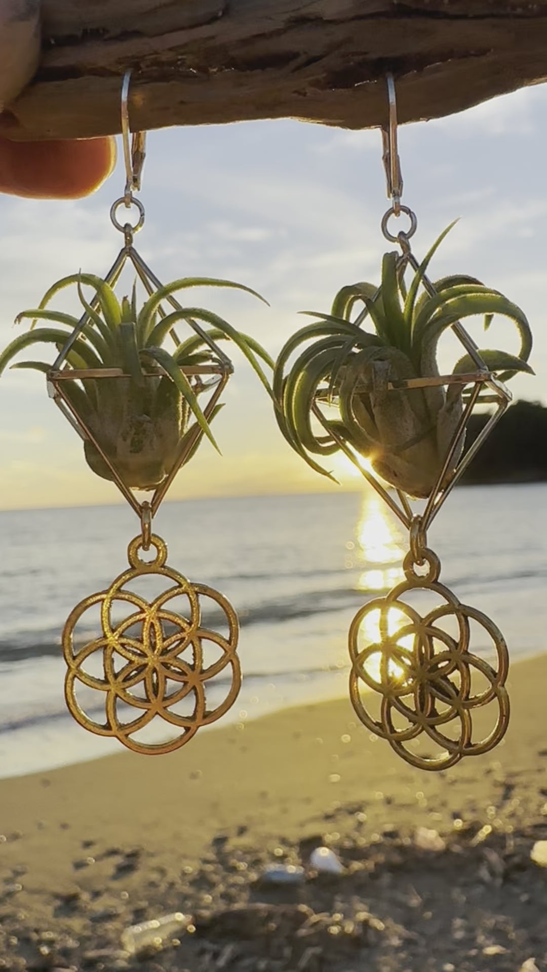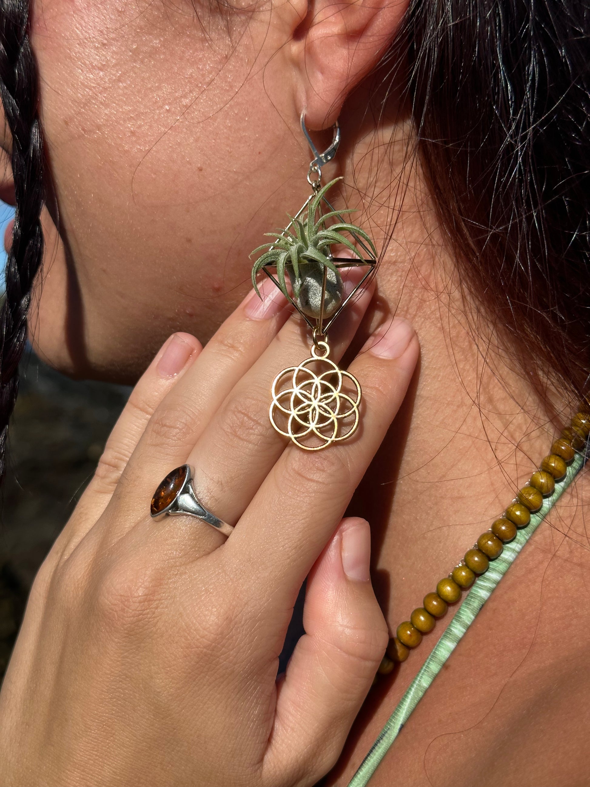 Power-up with Plants and Crystals adorning your body! Octahedron Geometric Temples cradle living Air Plants while they charge and meditate next to your face ~ bringing you fresh air and great energy! Adorned with a sequence or Black Pearl and Shungite. Shungite is a stone that protects you from EMF cellphone radiation. Sterling Silver Leverback Earring Hooks Clips onto Everything; It's a Multi-functional jewelry piece. Stay protected and super charged!🌿