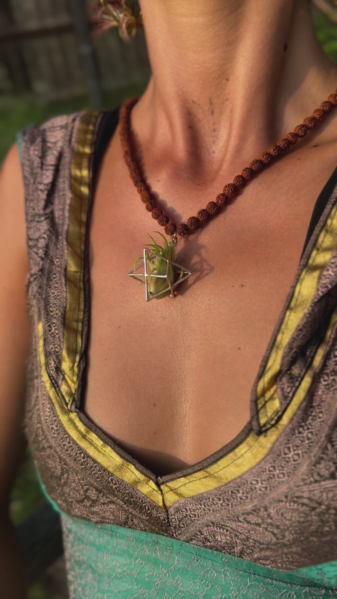 24K Gold Merkaba Air Plant Terrarium Monk Necklace ~ Buddha Prayer Rudraksha Beads