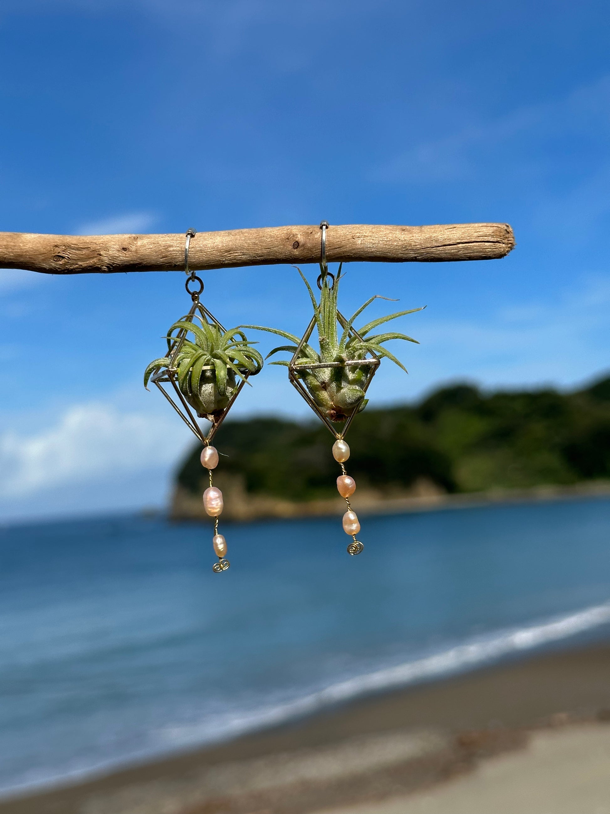 Be Eco-Elegant with these Cute, Minimalist, Pearl Air Plant Earrings! Octahedron Geometric Temples cradle living Air Plants while they charge and meditate next to your face ~ bringing you fresh air and great energy! A sequence of 3 Genuine Pearls dangle. Sterling Silver Leverback Earring Hooks Clips onto Everything; It's a Multi-functional jewelry piece. Stay Symbiotic and inspire many!🌿