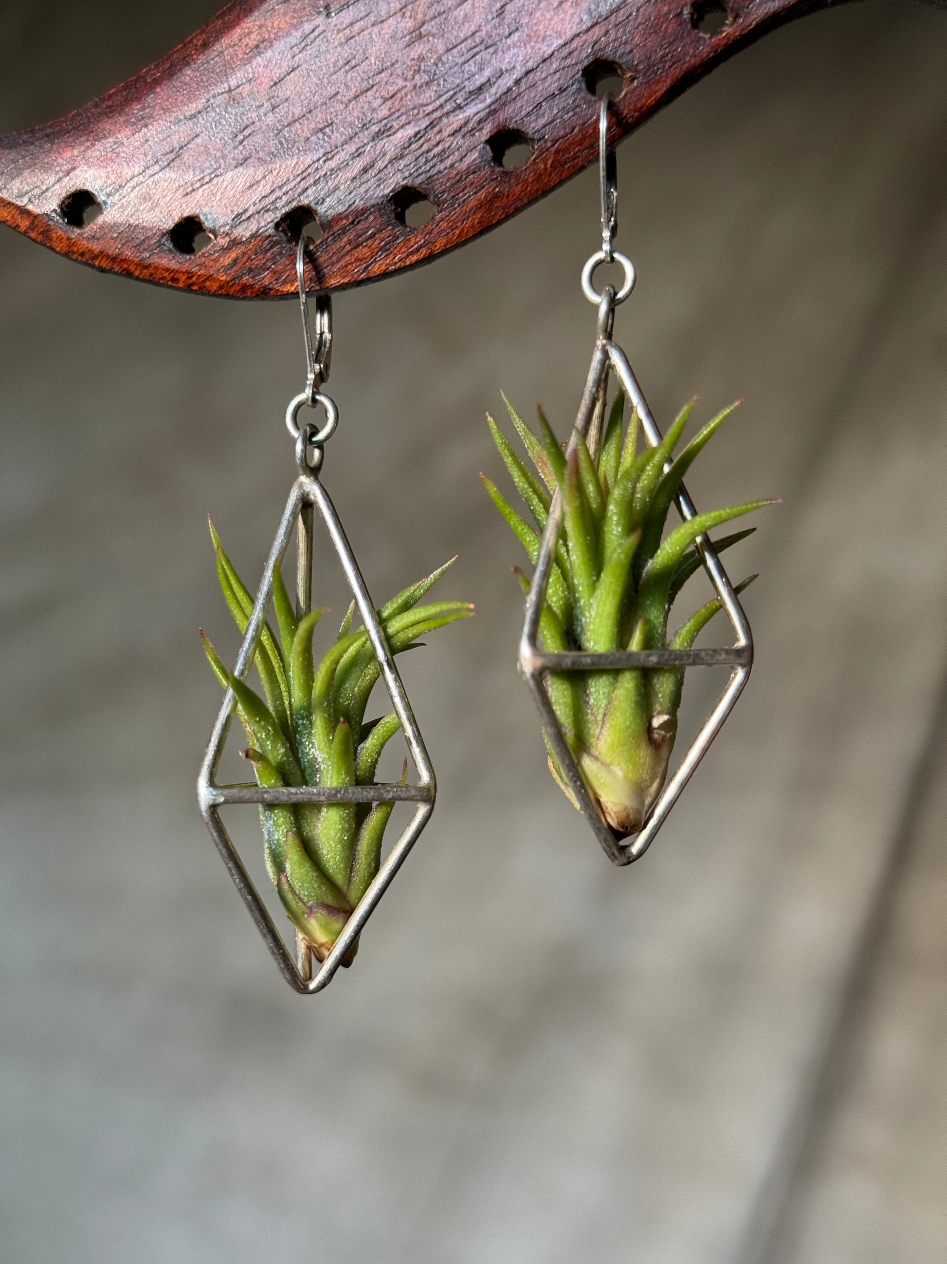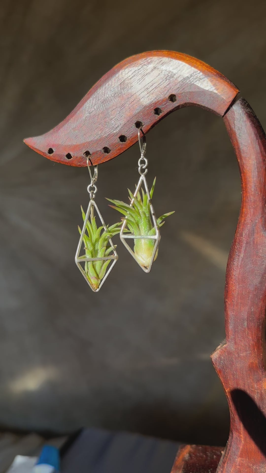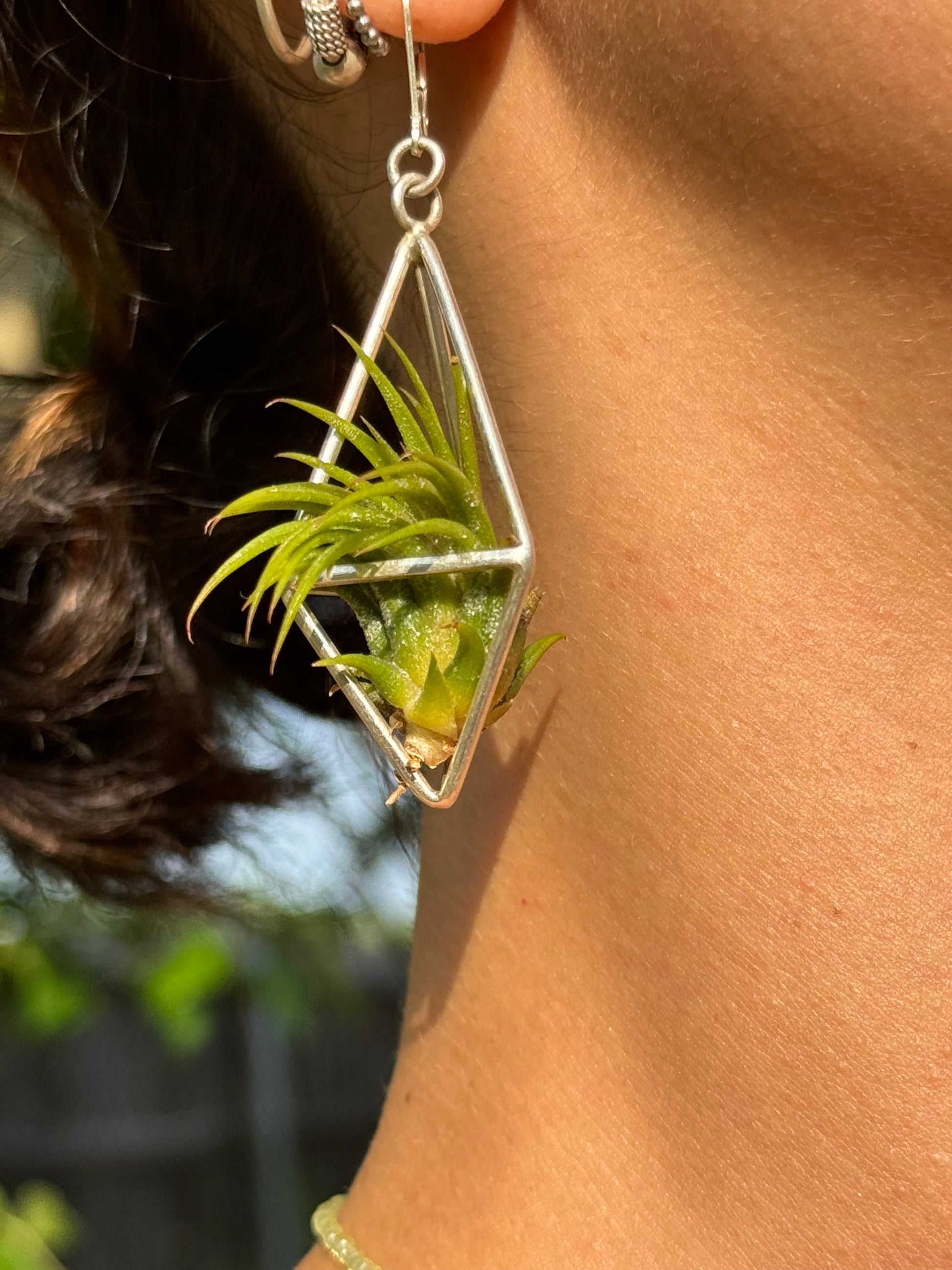 Solid 925 Sterling Silver, Custom, Eco-Lux Living Air Plant Earrings are elegant and minimalist while making a statement! That our Style can be Symbiotic with Nature. The slender golden geometric double tetrahedron gently cradles the air plant securely in place, next to your face! ~ Bringing you Fresh Air and Great Energy! These dainty, minimalist Plant Earrings are perfect for any occasion! Guaranteed Unique Style that will Turn Heads & Intrigue.🦋