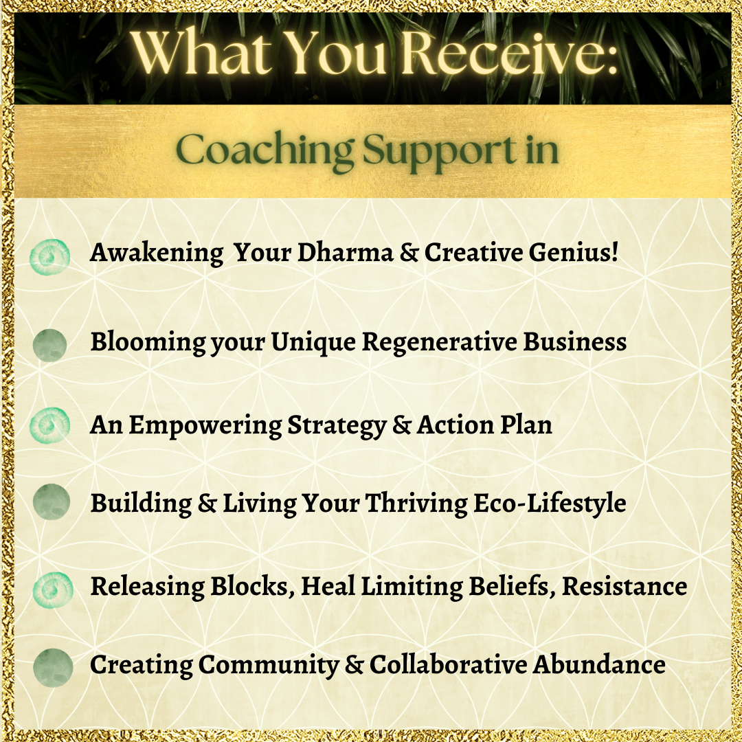 Through our support systems, we will expand our collaborative abundance, and interconnectivity on this path. You will receive private 1:1 coaching to discover ways for both your business, and lifestyle to be Regenerative.