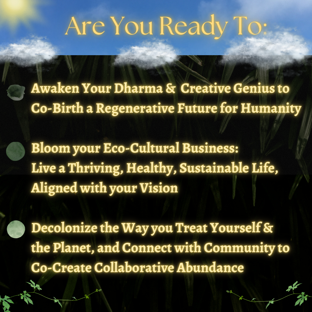 The Regenerative Dharma Accelerator is a coaching program that helps you awaken your soul-aligned purpose, and birth your own unique ecological and/or cultural creative business movement that amplifies your unique, positive impact on the planet, while thriving in your life. This program is for: