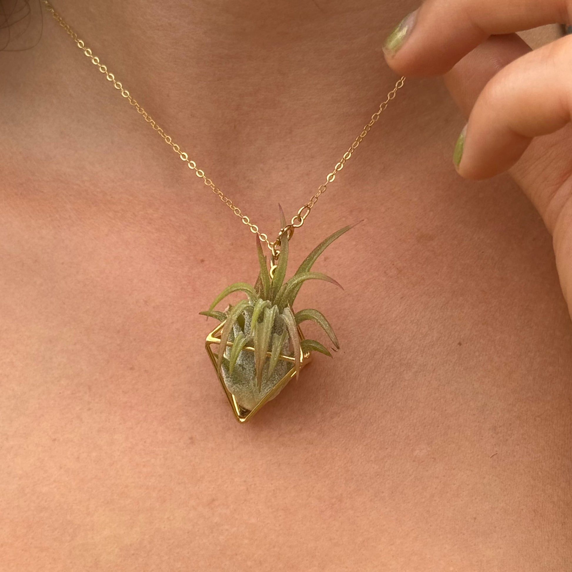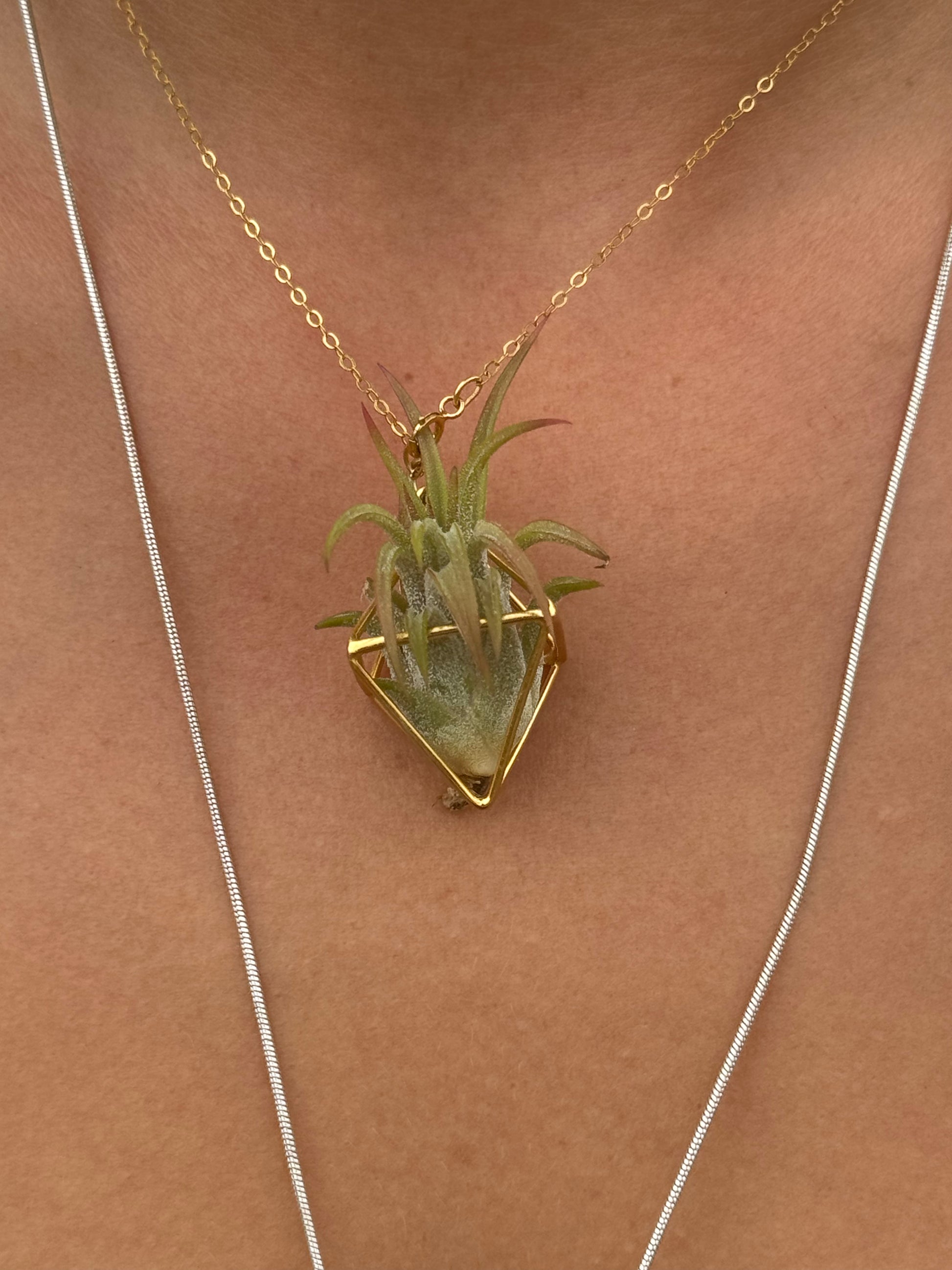 Eco-Lux, Minimalist Air Plant Octahedron Pendant in either 925 Sterling Silver or 24K Gold Plate, Glimmering in Elegance. The Air Plant charm is cradled in its temple like a Baby Star in a Golden Cage ๐ Our designs supports the plants interchangeability, and its full beautiful display! Embody Symbiosis๐