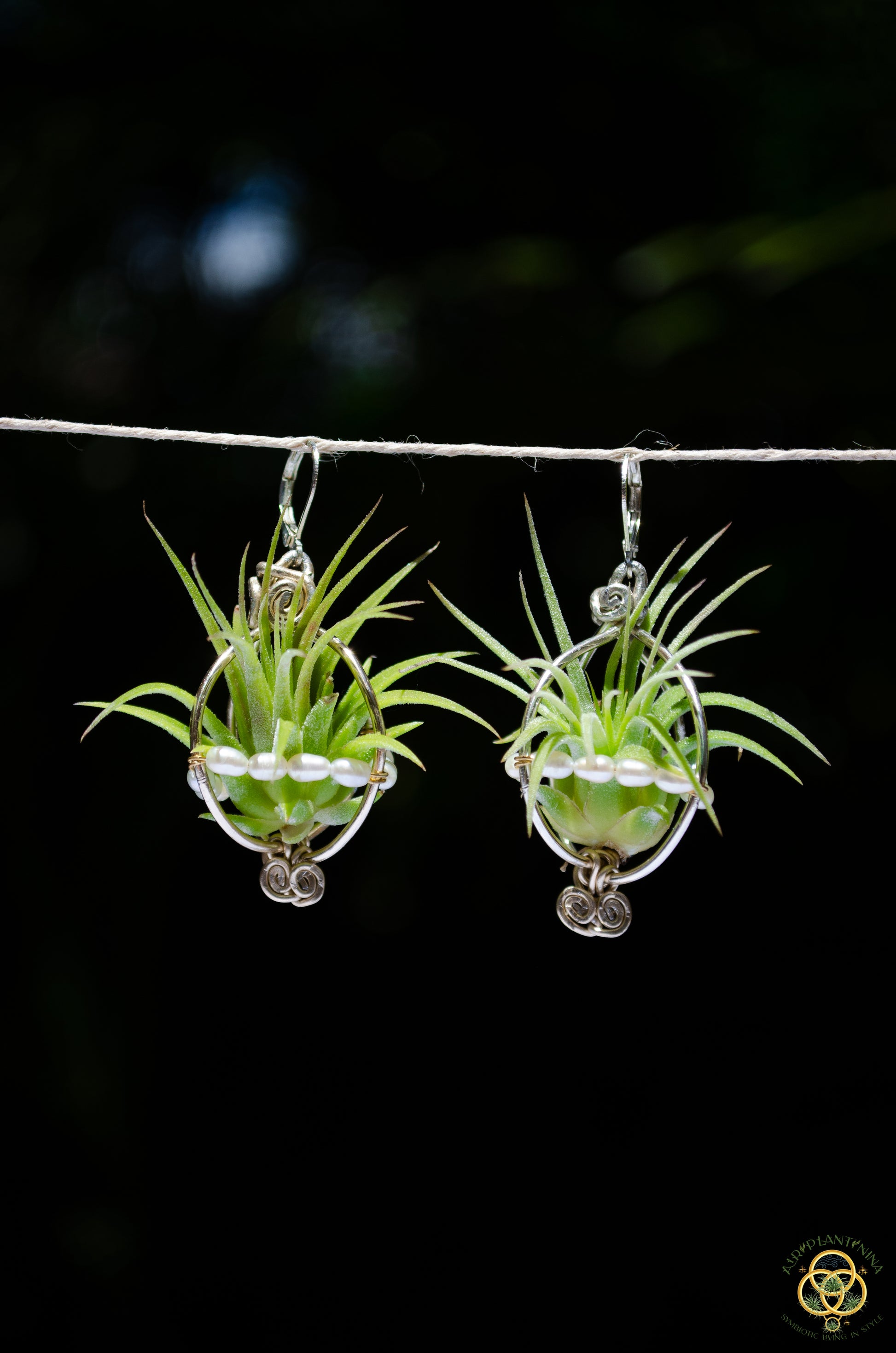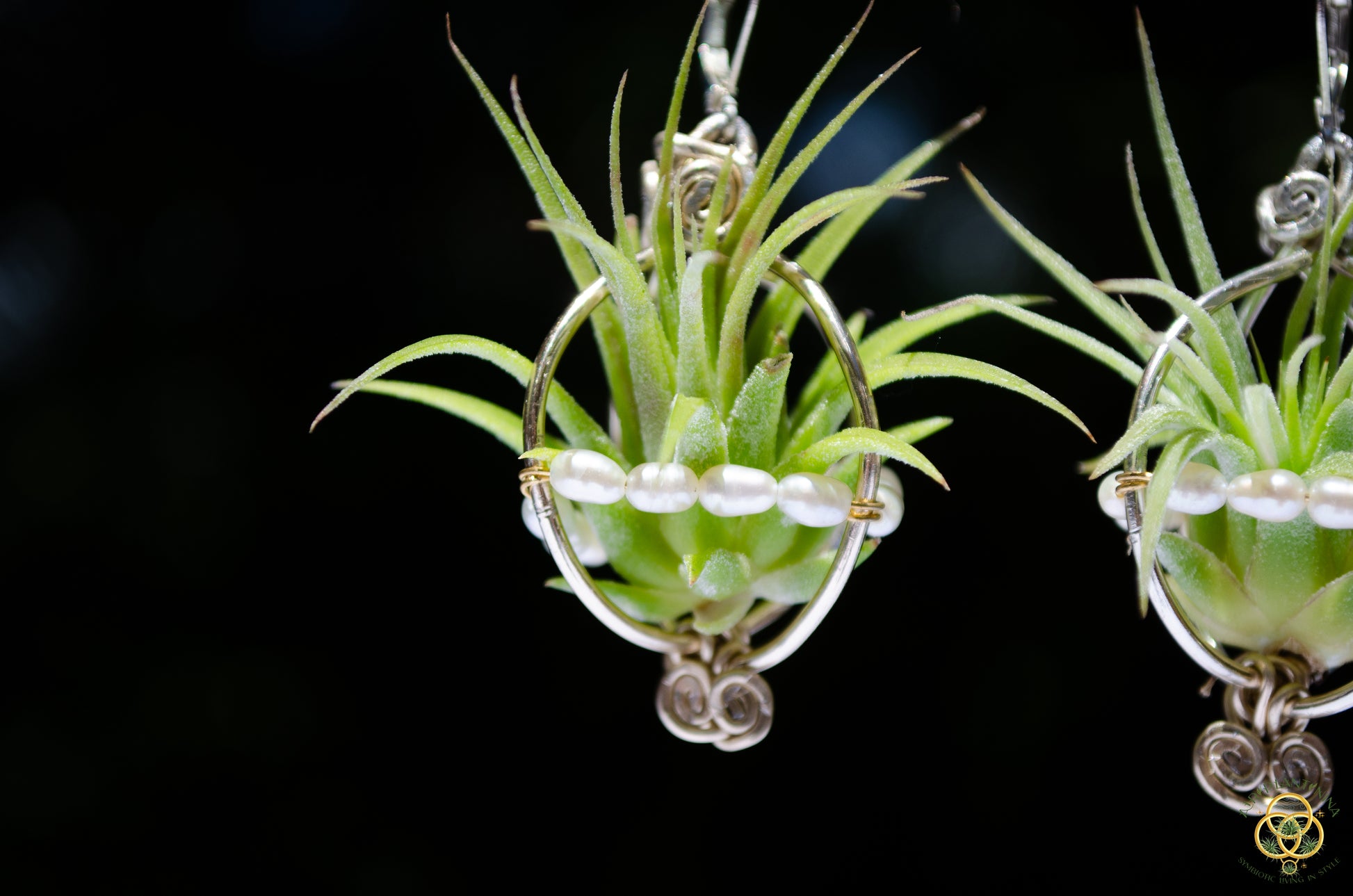 Minimalist, Dainty, Classy, Pearl Air Plant Earrings. Perfect for Weddings, or to just add a little elegance in your daily style! Living Air Plants are comfortably meditating inside luxurious Pearl Lined Temples, while bringing you Fresh Air and Great Energy! Pearls surround the plant 360 degrees. The Air Plants are almost like Cinderellas in there pearl pumpkin coach carriage. The plants n' you deserve that royal treatment.💚