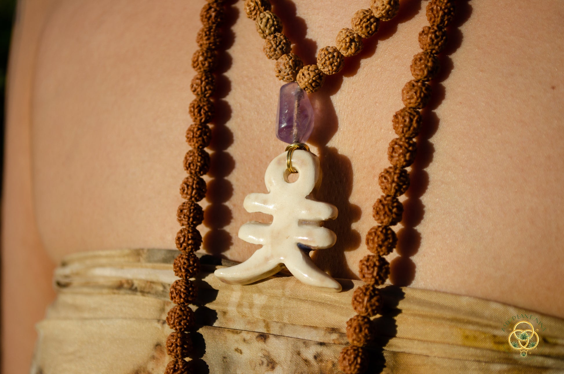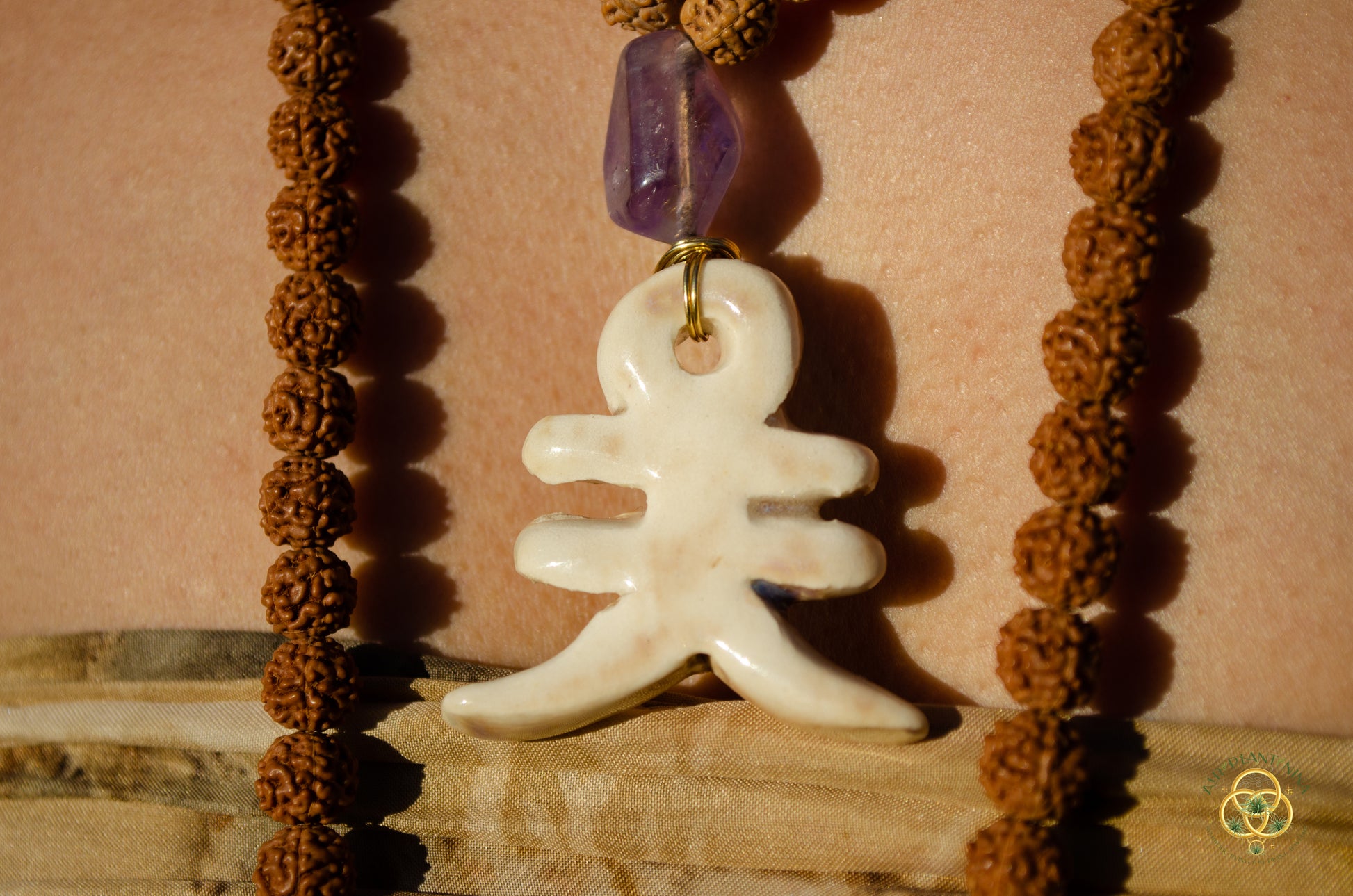 One of a Kind Ceramic Necklace! Celestial Protector, "Ankh-Ten" represents the union of Ankh (Eternal Life) with "Ten," the Heavens. This "Ankh-Ten" is an original ceramic character hand-shaped with earth clay. It resembles an Egyptian Ankh Wadjet, which is a winged serpent goddess. Heavenly Protectors in Eastern philosophy is also symbolized as a serpent or dragon. It is adorned with Rudraksha Tree Seed Beads (Monk Beads) that have qualities of protection and guidance. At the apex is either a Amethyst crystal, or Buddha with tigers eye and various crystal beads. This is a powerful piece bringing peace & protection into your life.