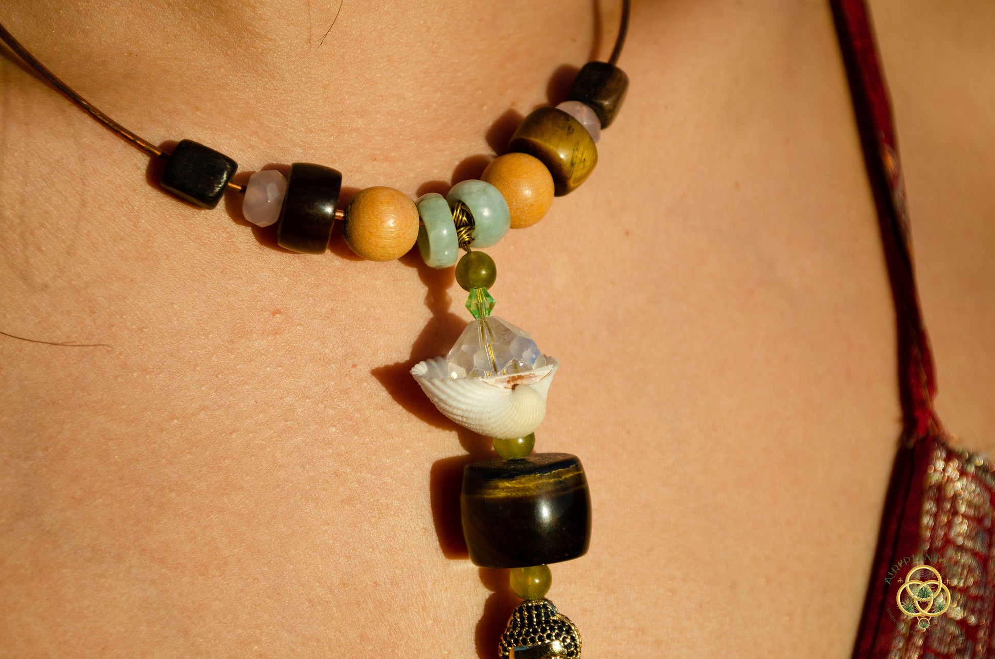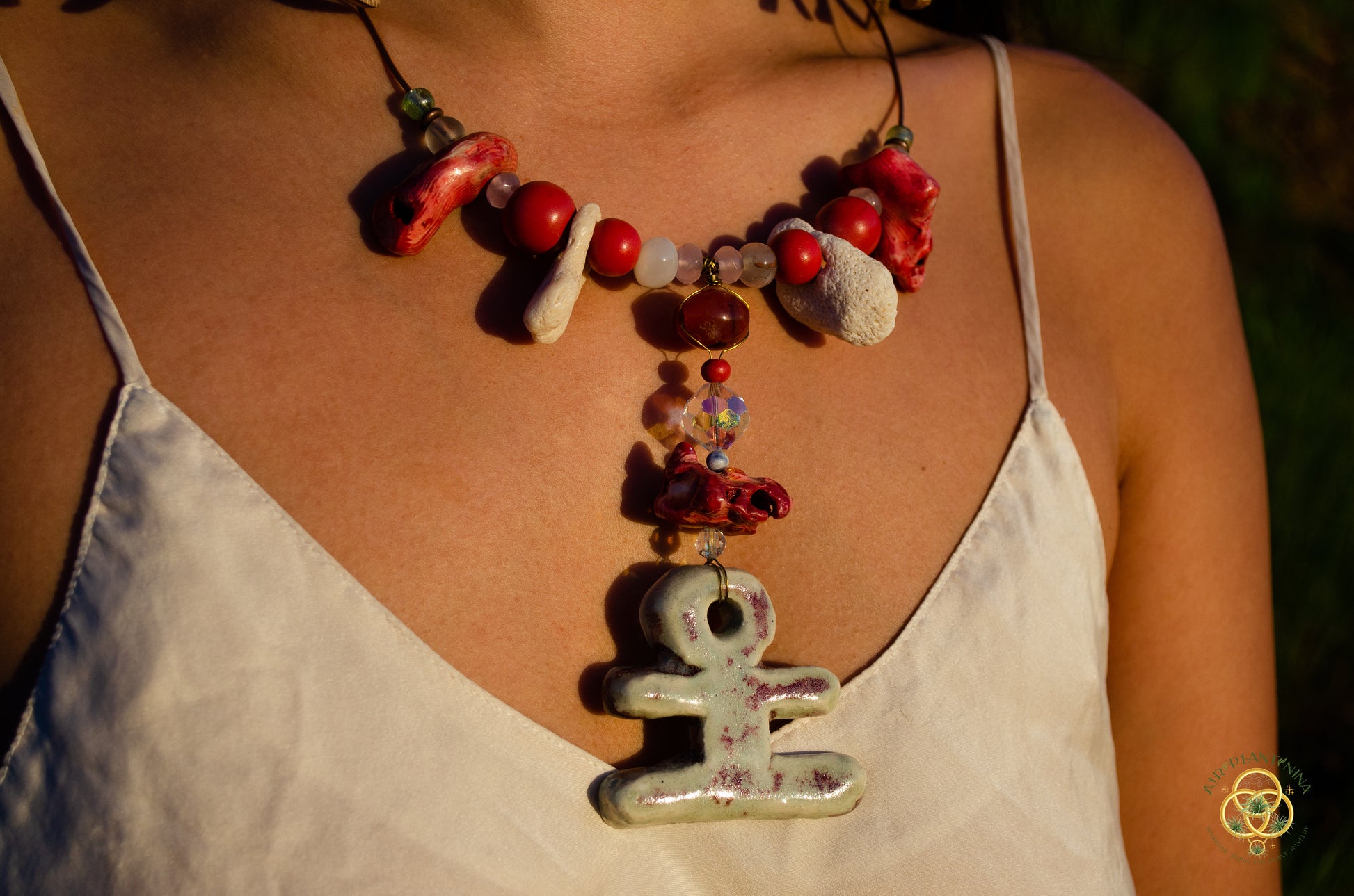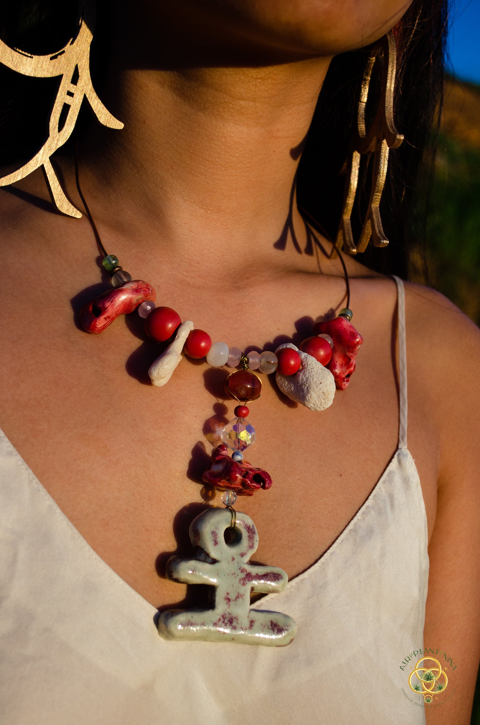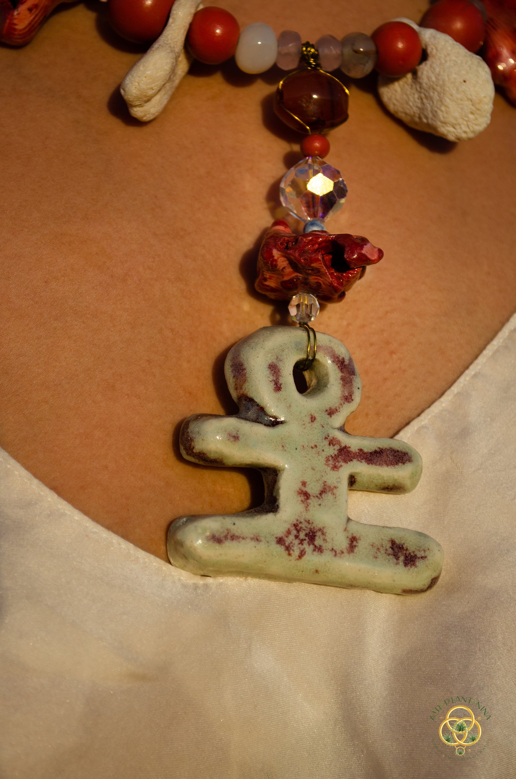 One of a Kind Ceramic Necklace! The union of Heavenly and Earthly forces, "Ankhor" represents the union of Ankh (Eternal Life) with "Do" Earth. It resembles an Anchor. This "Ankhor" is an original ceramic character hand-shaped with earth clay. It is adorned with Rudraksha Tree Seed Beads (Monk Beads) that have qualities of protection and guidance. At the apex is a wire-wrapped genuine Quartz Crystal Pyramid, amplifying your energy, and shining bright. Multiple options available, including Ankhors with Corals and Crystals, as well as Adventurine Magatamas.