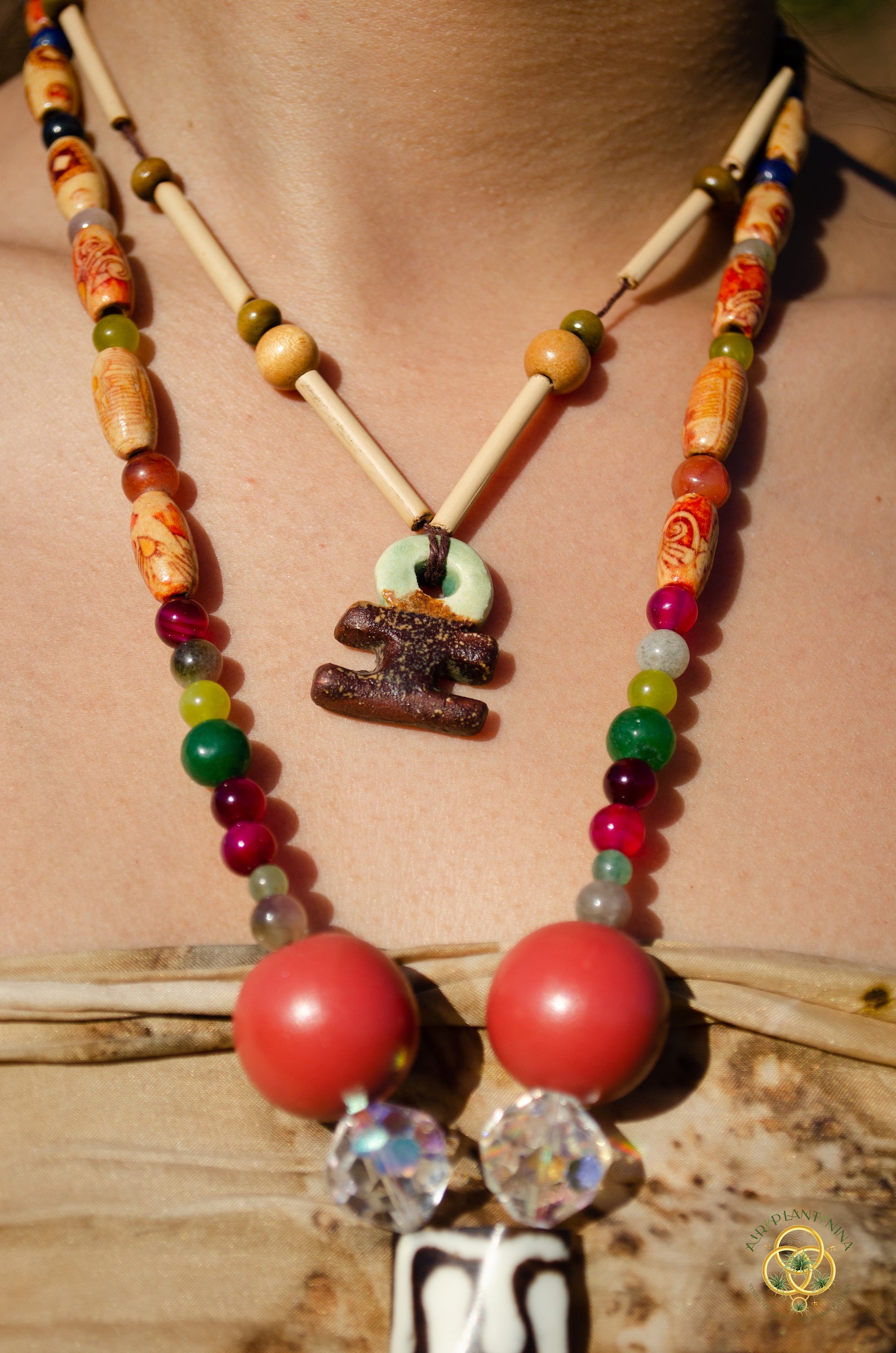 One of a Kind! Embody the Abundance of Nature. Arrangement of heirloom gemstones and pieces, woven into an intricate necklace, with bold pieces in the center. 1. Large Read Coral 2. Buddha with a Crystal Crown, 3.Hand Painted Asa-No-Ha Sacred Geometry Wood, 4. Camel Bone 5. 2 Large Crystals 6. Wooden Beads. Bold, Powerful, Beautiful.โจThrive with your Symbiotic Style!๐ฆ