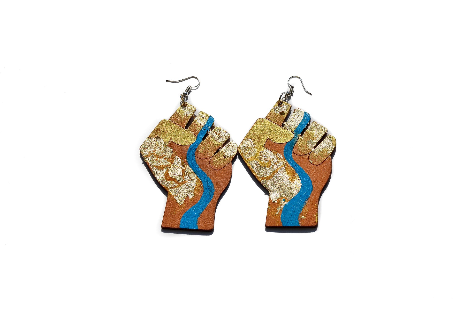 Earth Power Fist Resilience Flower Power Gold Leaf River Laser Cut Earrings (Real Gold Leaf)