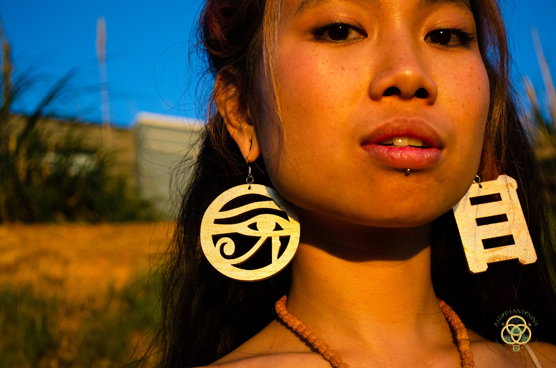 Glowing, Golden, and Bold. Eye of Horus represents the Third Eye, Healing. and Protection. The Kanji side is read "Me," or Eye. Ankanji is a Light Language that unifies the wisdom of diverse lineages; it is a combination of Kanji, Japanese, Kemetic, and Sacred Geometry. With the unification of sacred symbols new meaning is created and decoded. ~ Designed and Laser-cut onto Wood by Nina. Earrings are extremely light weight and easy to wear.๐โจย