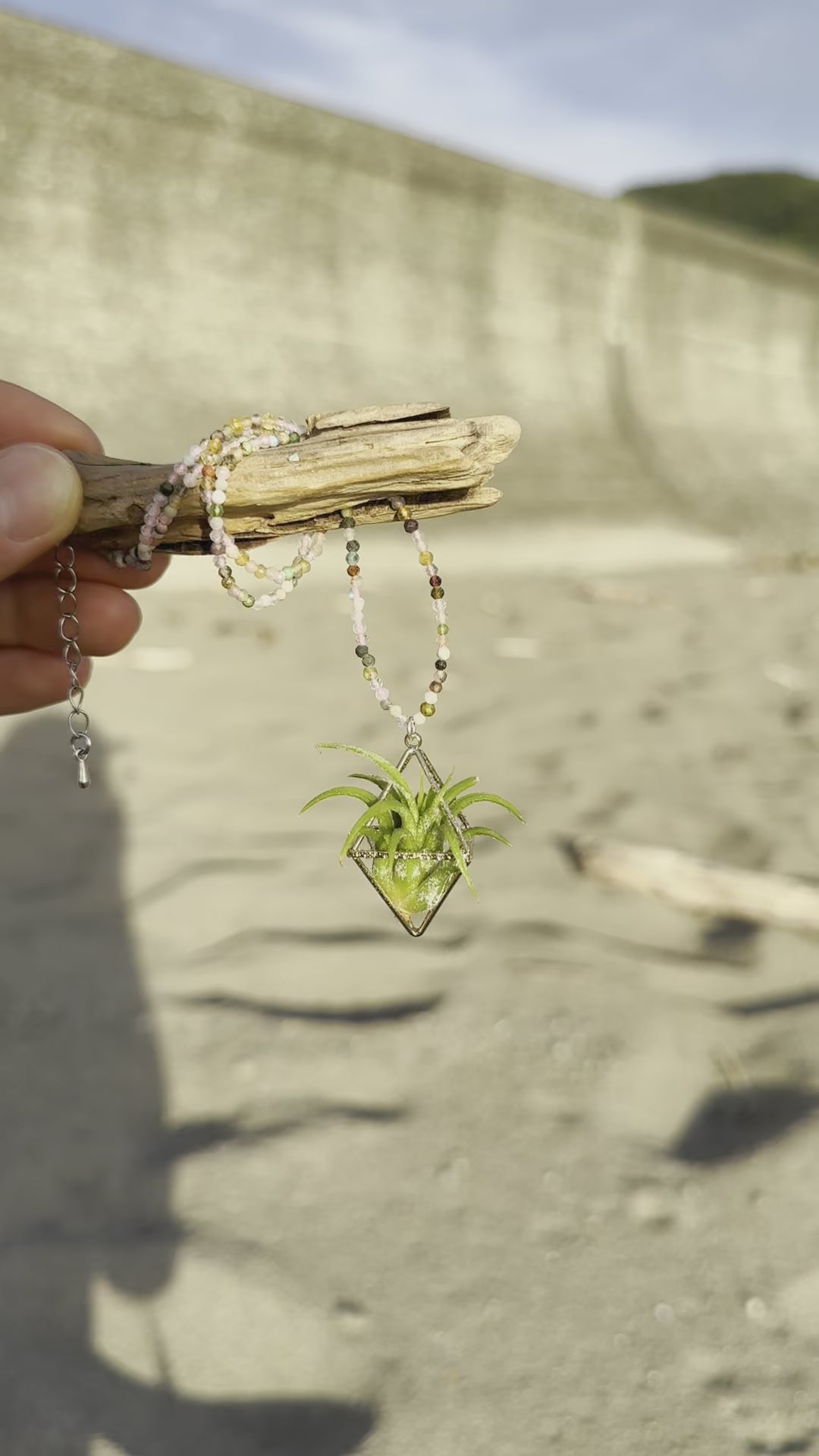 Simple, Elegant, Living Air Plant Pendant. Plant is cradled in its Octahedron geometric temple like a Baby Star in a Cage ๐ Power-up with Plants and Crystals. Select your favorite crystal beaded necklace. This Minimalist pendant rests elegantly on your sternum. Embody Symbiosis ๐ย ~ bringing you fresh air and great energy!