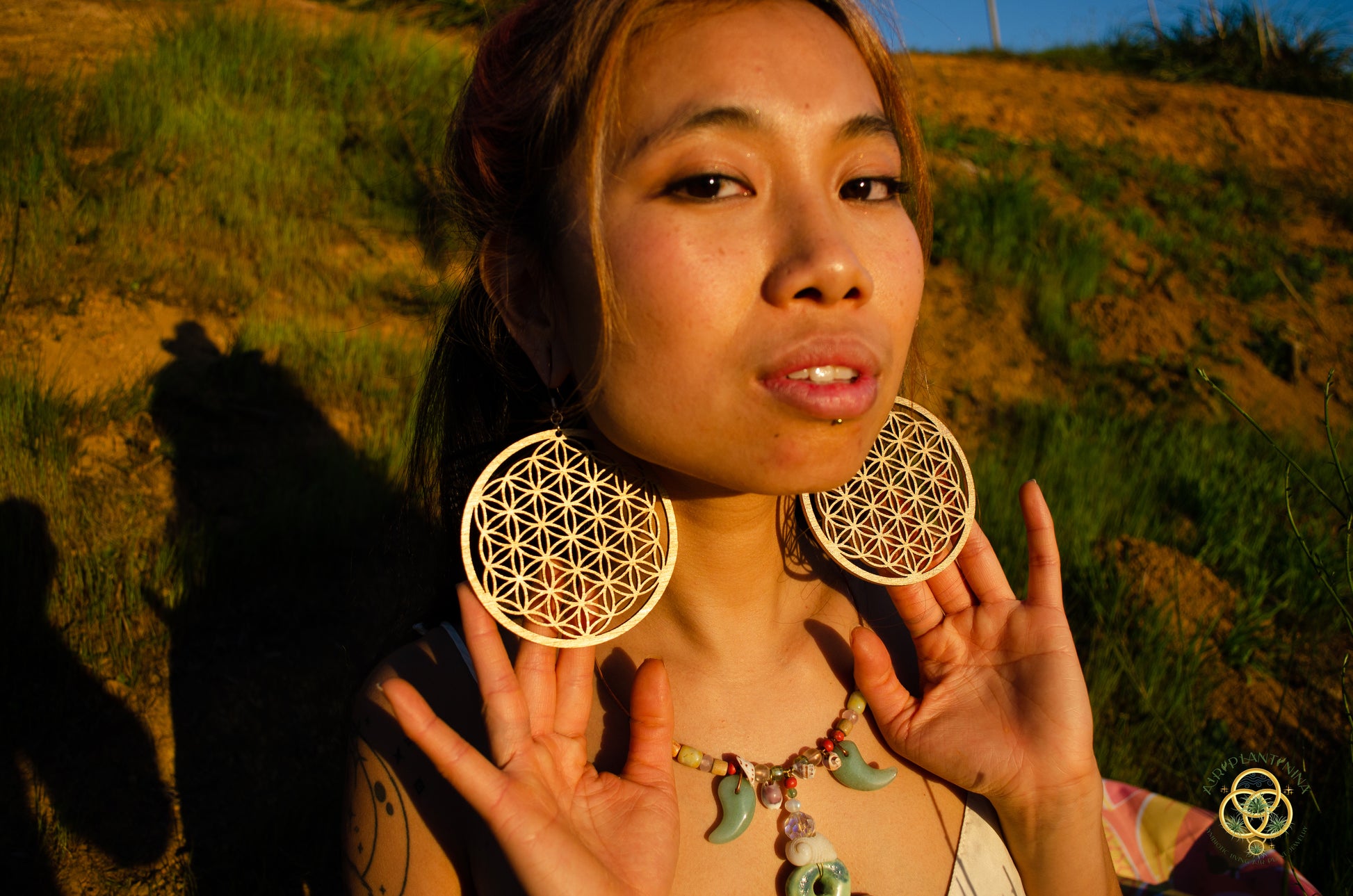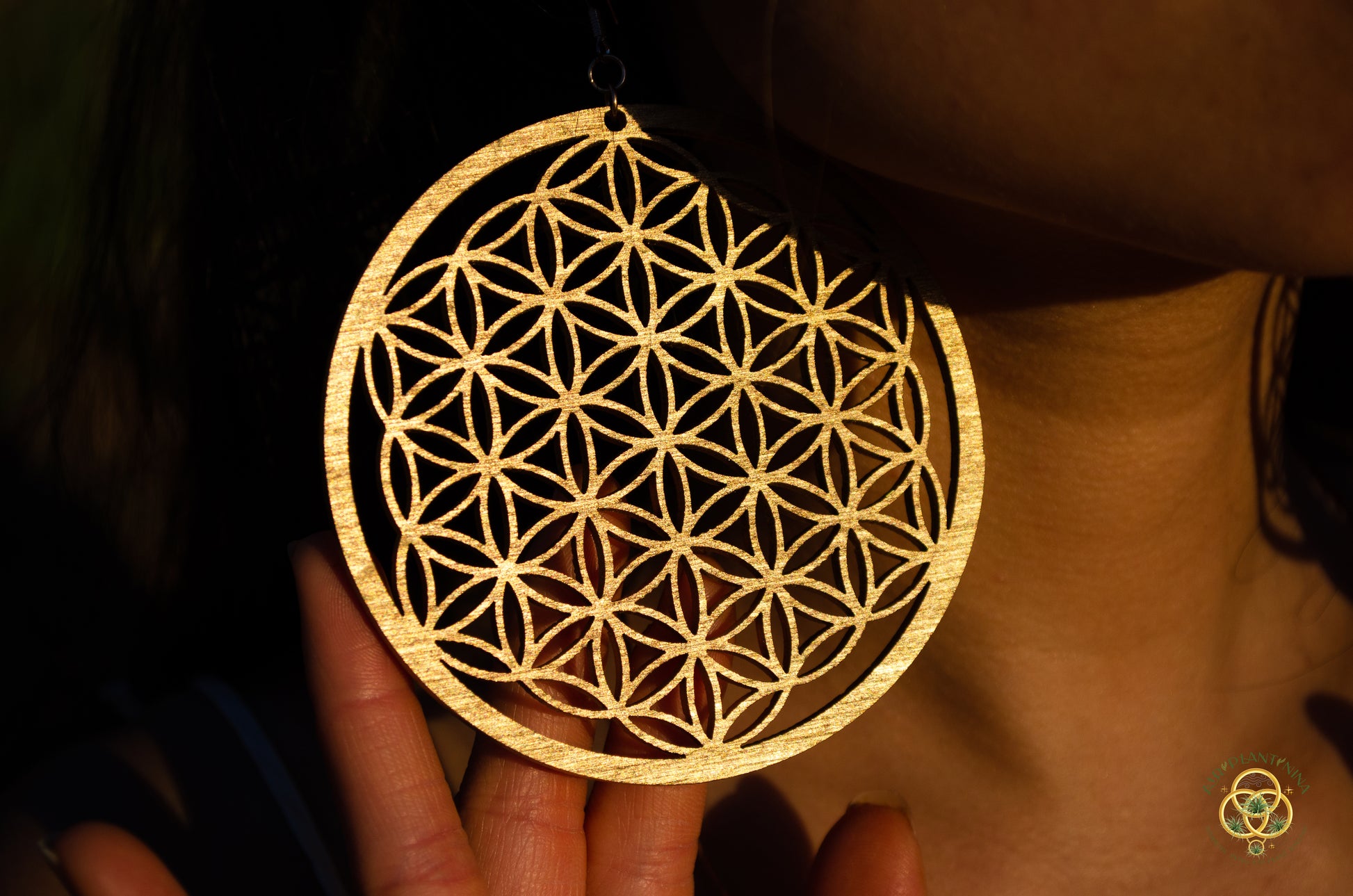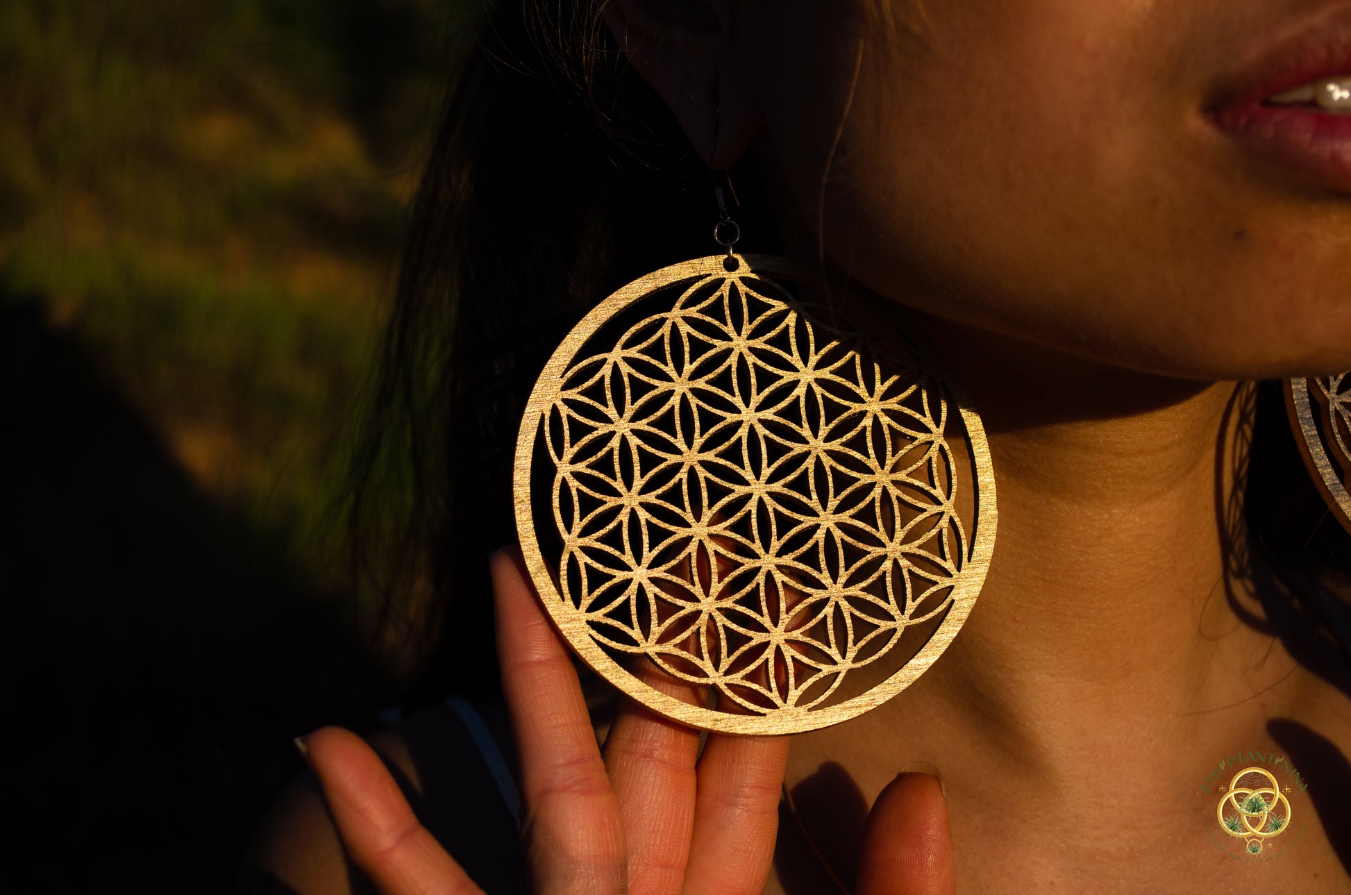 These Golden Glowing Flower of Life are a Beautiful Bold Statement.It represents the geometry of nature and all of creation. ~Designed and Laser-cut onto Wood by Nina. Earrings are extremely light weight and easy to wear.๐ย This next-level Eco-chic style will inspire many, while they bringing you fresh air and radiant energyโจ