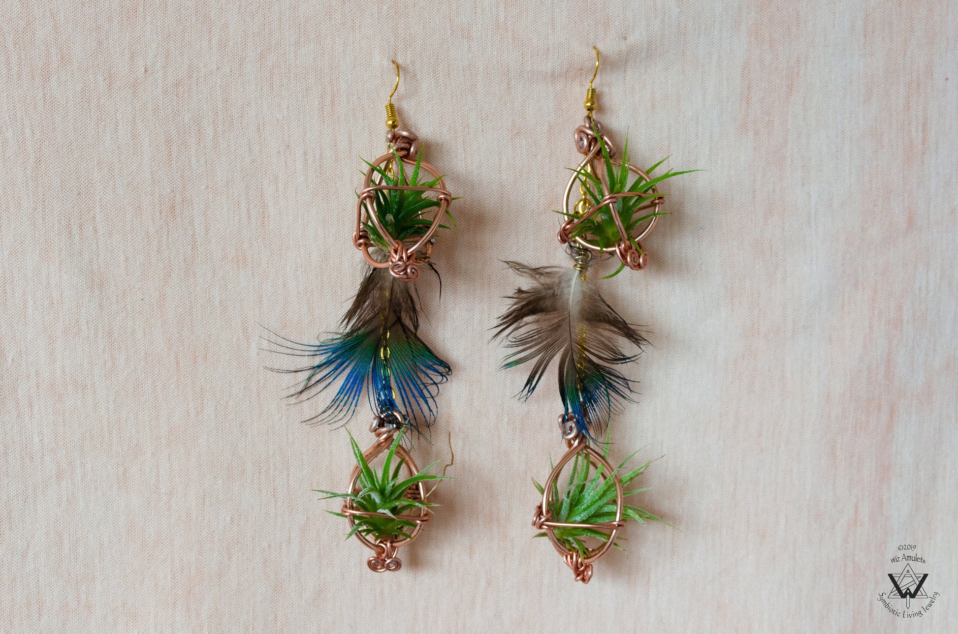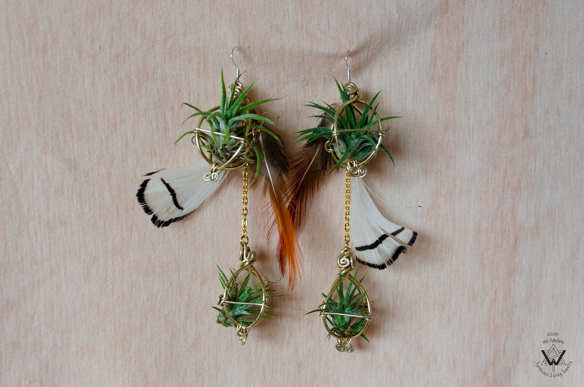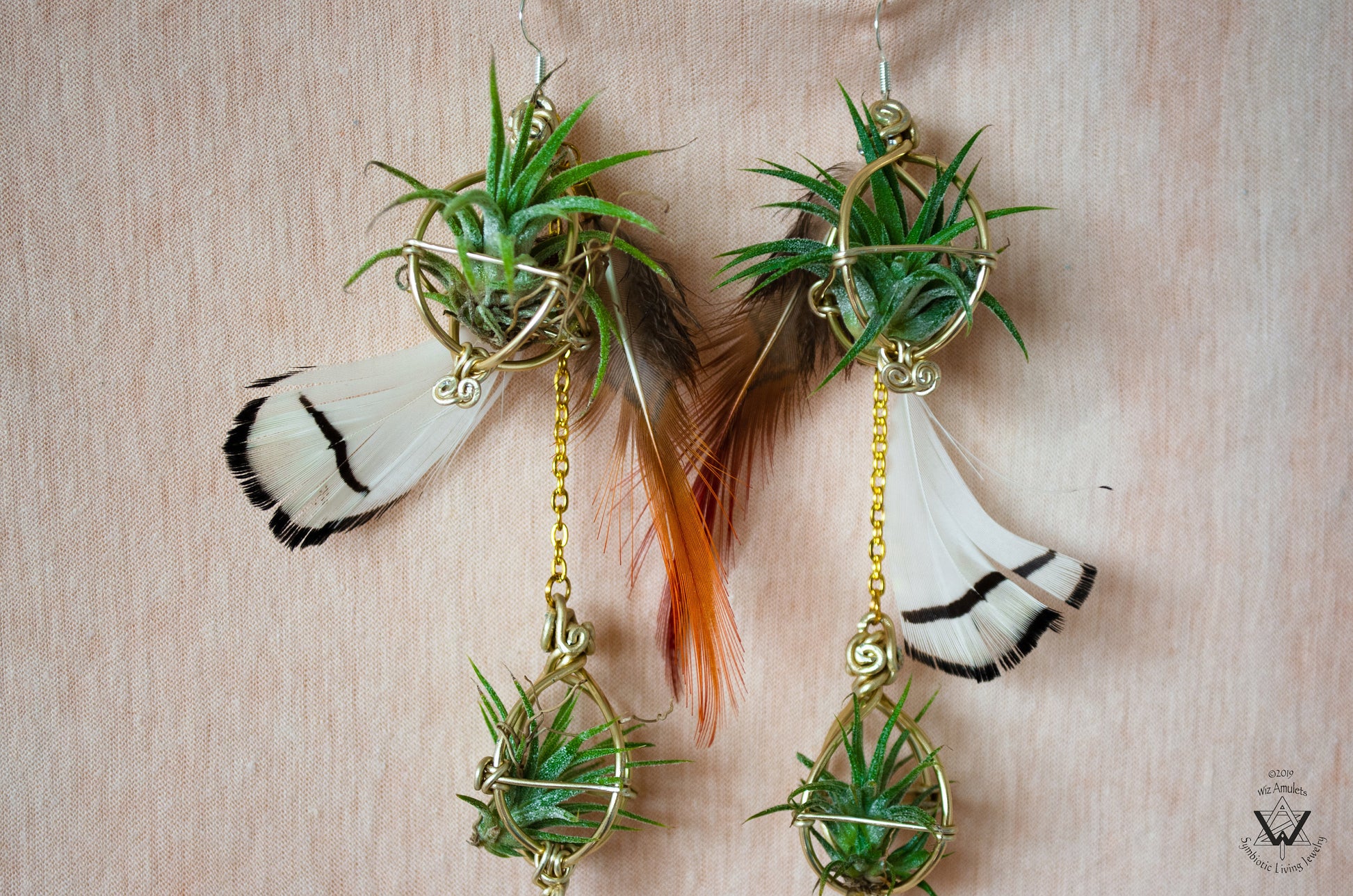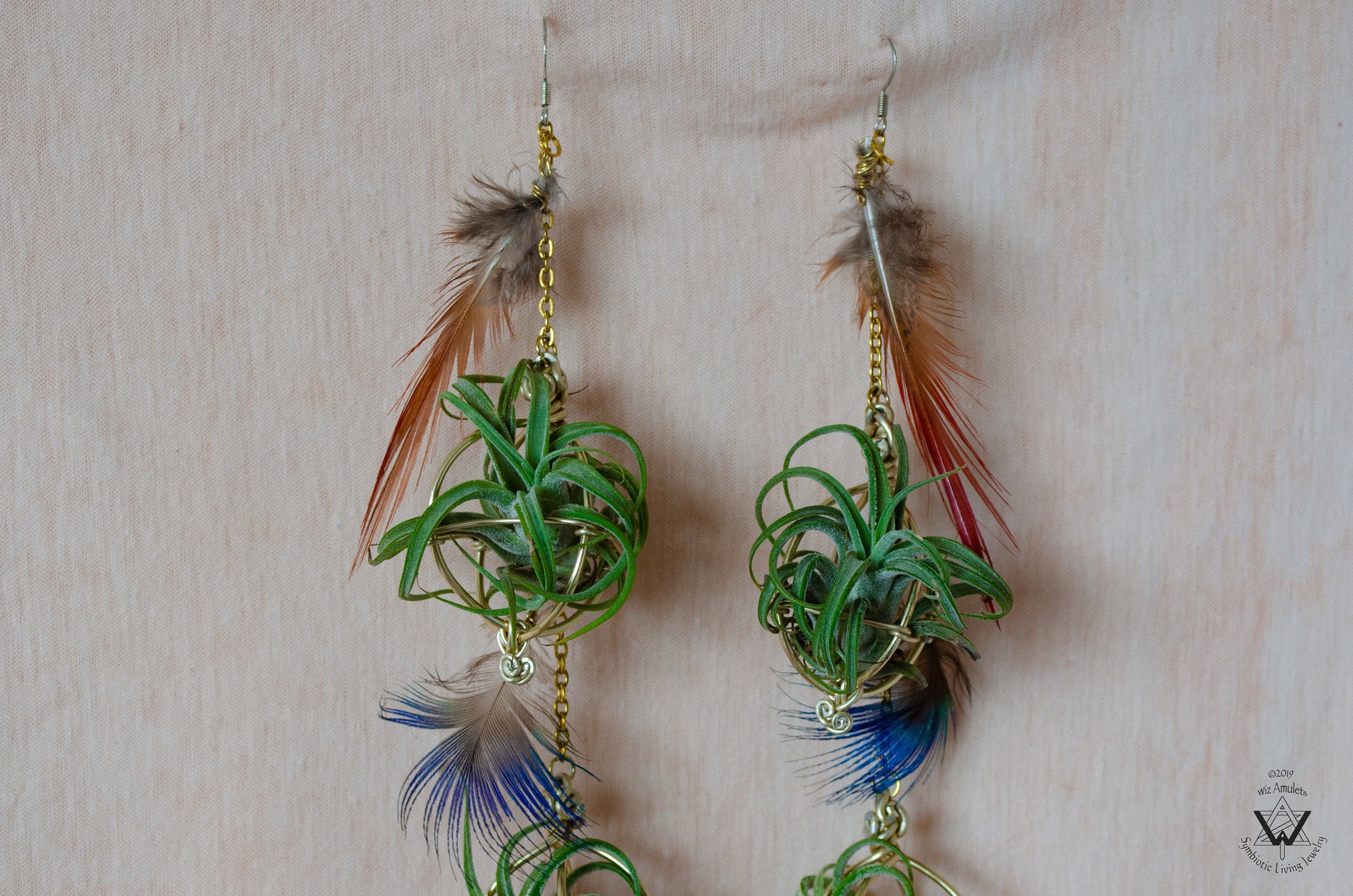 These Boho Chic earrings dangle with a selection of unique feathers and living air plants. Two thriving air plant orbs cascade and dangle from each ear. Choose from Octahedron Diamonds or Orbs. Sterling Silver Lever-back Earring Hooks are multi-functional and can securely clip onto anything you'd like to adorn! Take Flight with these Air Plant Ear-Wings๐ฆ