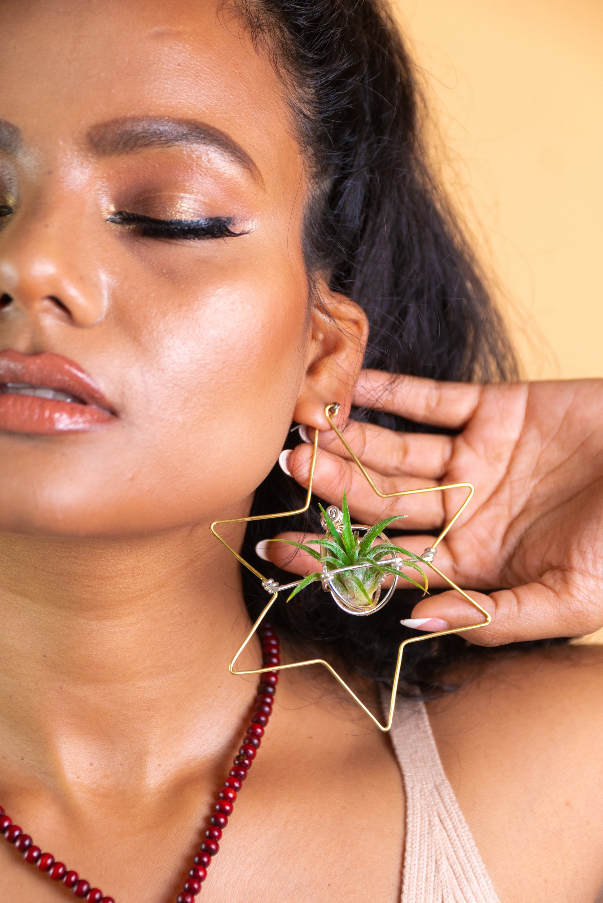 These “Eco-Sassy” Star Hoop earrings are ALIVE! Air Plants Charge n' Meditate in their Mer-ka-ba (Rotating Body of Light) Sacred Geometry Hoop Temples, bringing you Fresh Air and Great Energy! The Air Plant is interchangeable yet cradled in an orb temple that is suspended inside the Star Hoop earrings. Amplify your radiant energy.☀️ Thrive with your Symbiotic Style!🌿