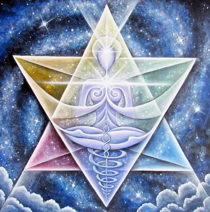 Mer-Ka-Ba: The Air Plants are suspended, meditating, and charging in the center of the Merkaba Hoop, which will give you an Energy Boost. The Mer-ka-ba is an ancient sacred geometry symbol, representing the union of the upper tetrahedron and the lower tetrahedron; Heaven and Earth. It is the divine light vehicle allegedly used by ascended masters to connect with those in tune with the higher realms. MER=rotating fields of light, KA: spirit, and BA: soul