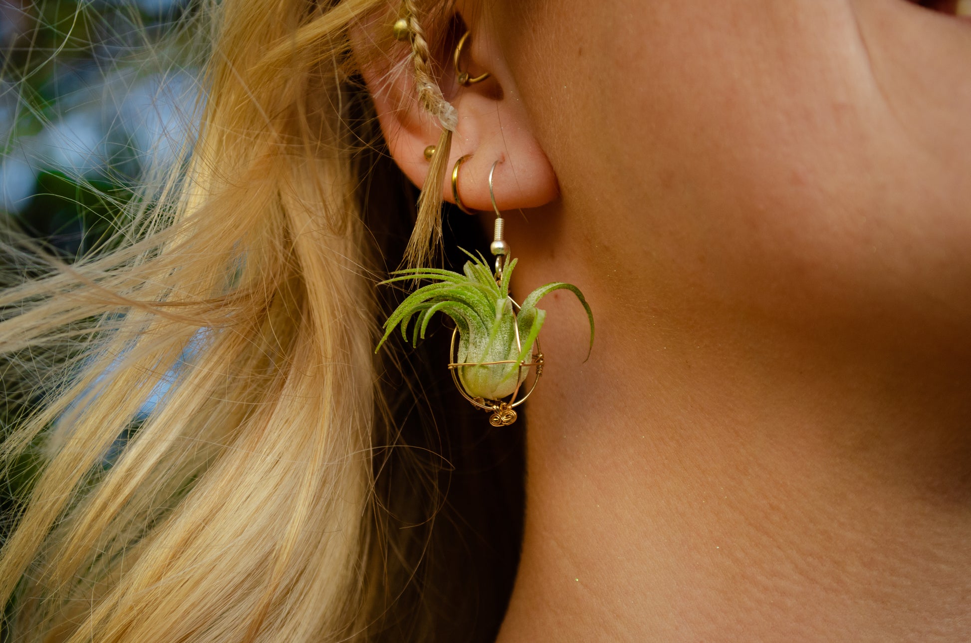 Minimalist, Elegant, Living Baby Air Plant Earrings, with 24K Gold Orb and Gold Earring Hooks. The Air Plant charm is cradled in its orb like a Baby Star in a Golden Cage ๐ Our designs supports the plants interchangeability, and its full beautiful display! Embody Symbiosis๐