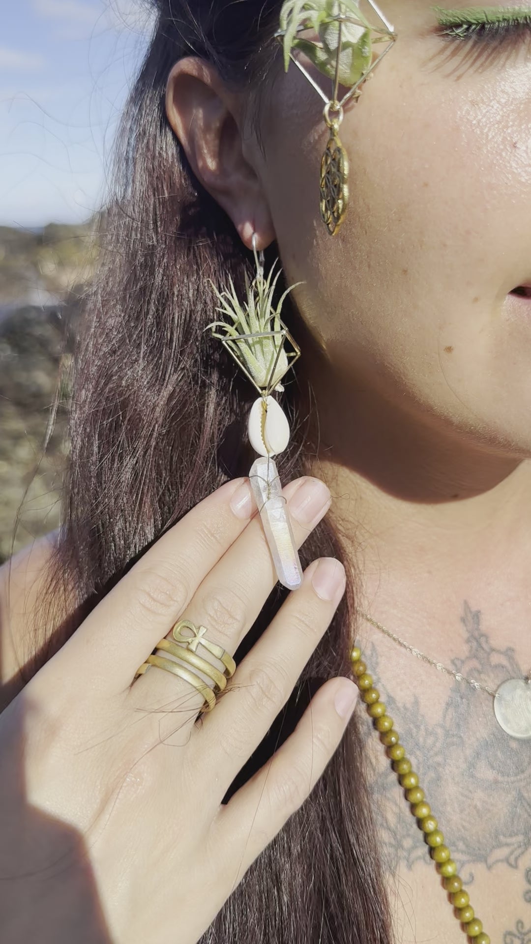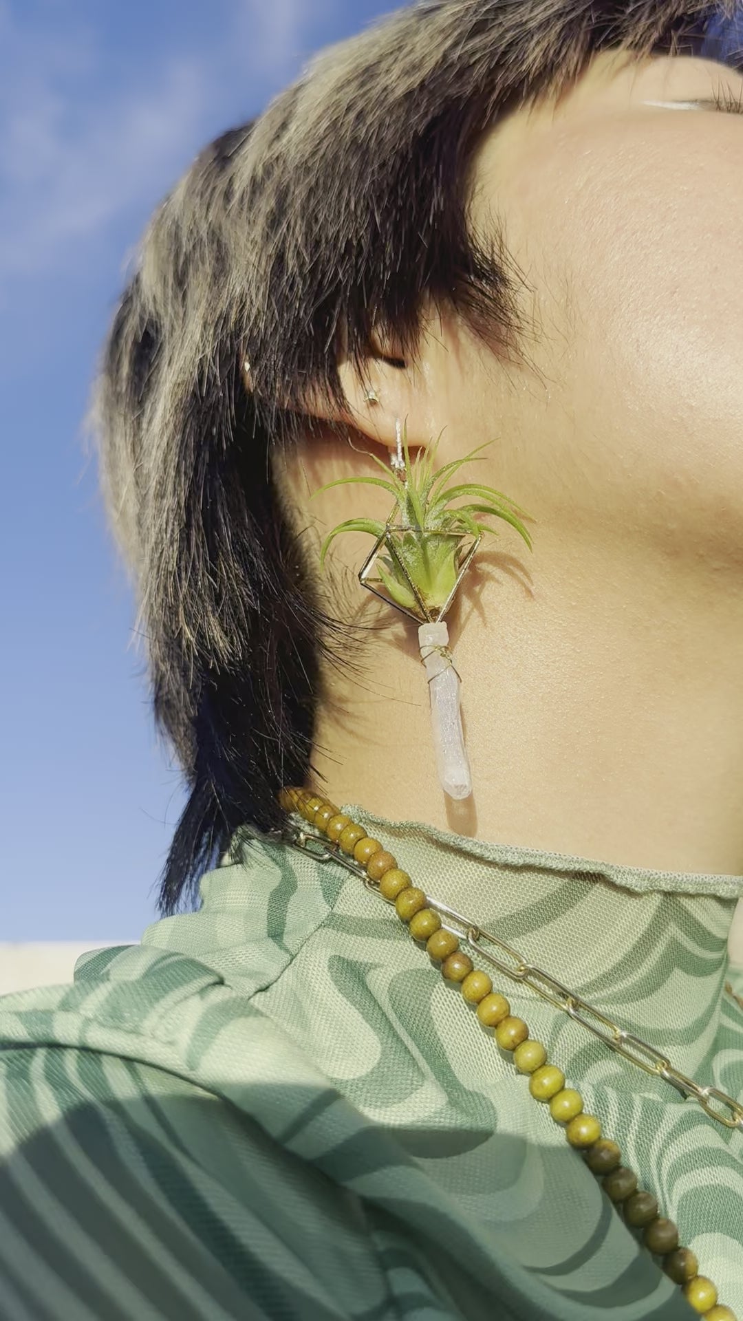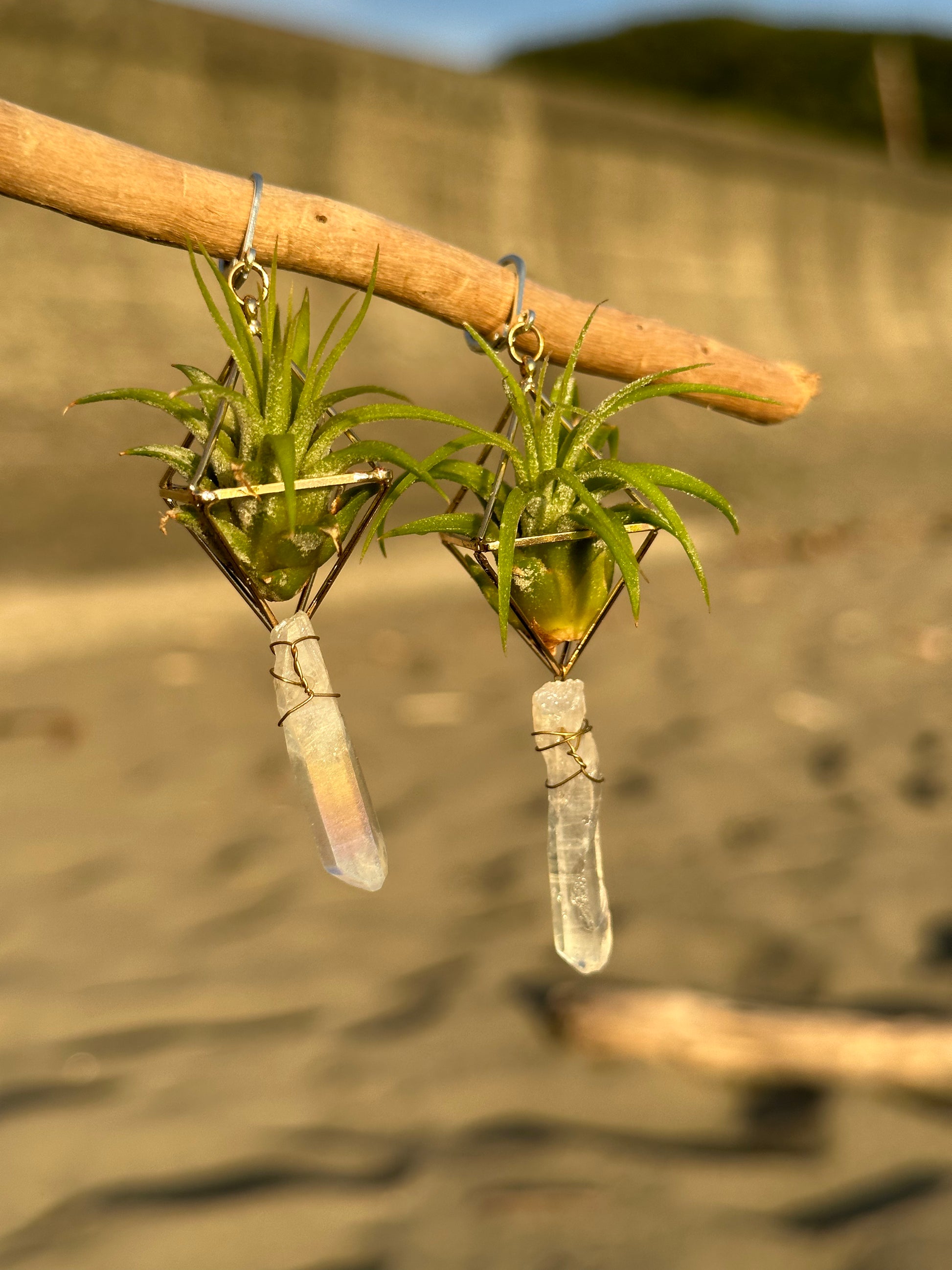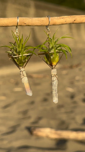 Super-Charge and Thrive with Real Living Plants and Crystals adorning your body! Aurora Rainbow Crystal Points dangle elegantly. Octahedron Geometric Temples cradle living Air Plants while they charge and meditate next to your face ~ bringing you fresh air and great energy! Sterling Silver Leverback Earring Hooks Clips onto Everything; It's a Multi-functional jewelry piece. Stay Elegant and Vibrant!๐ฟย