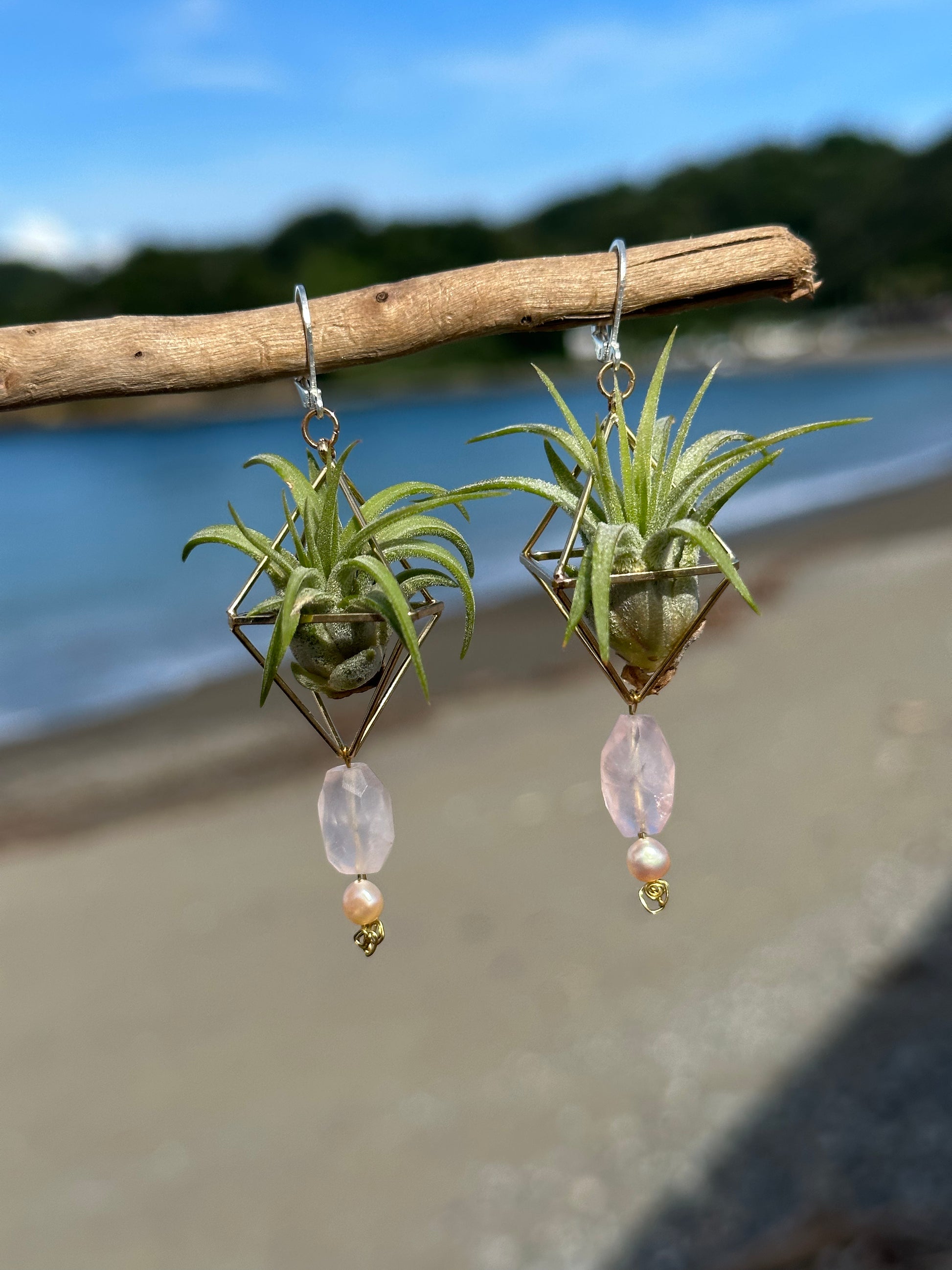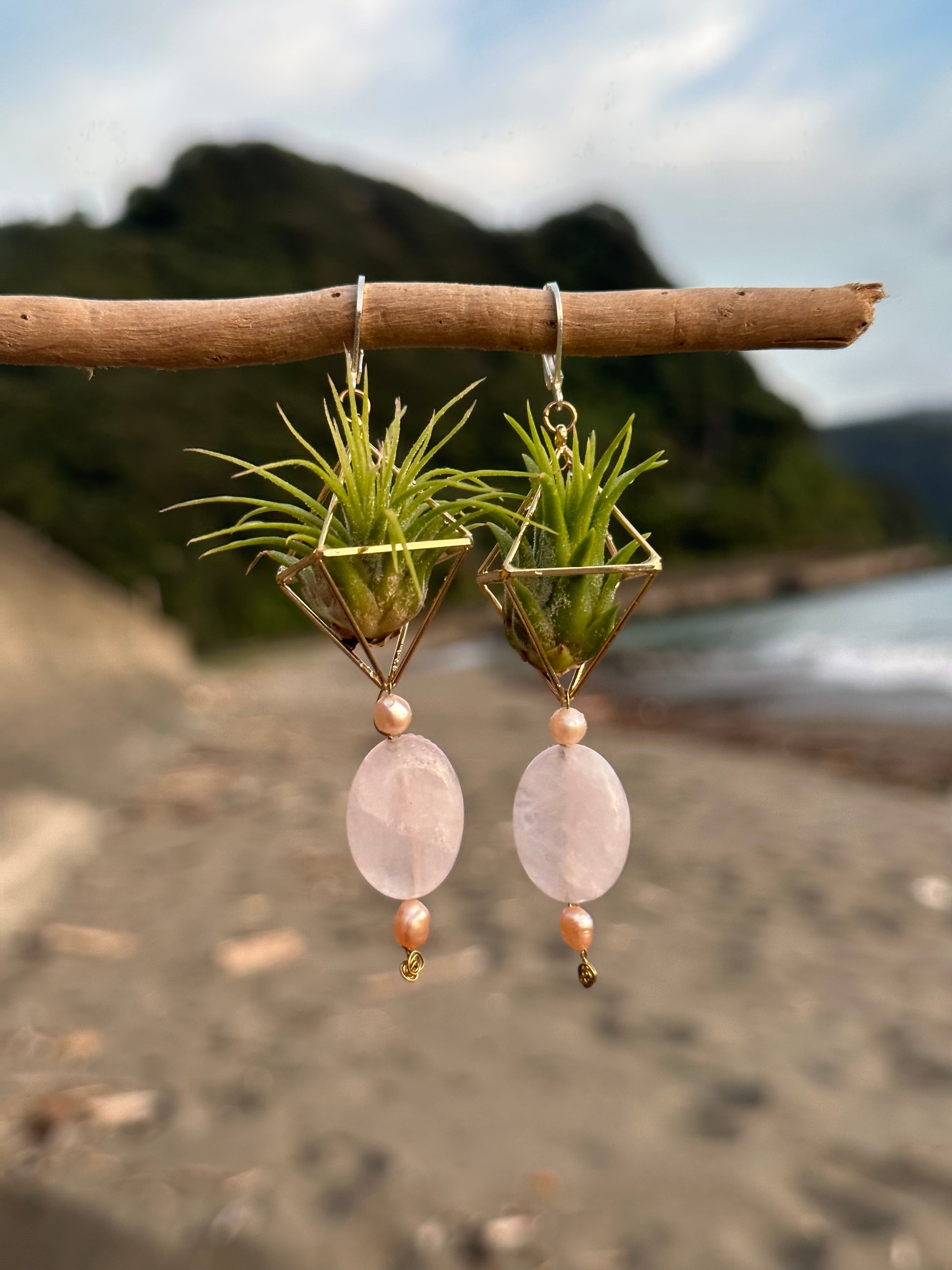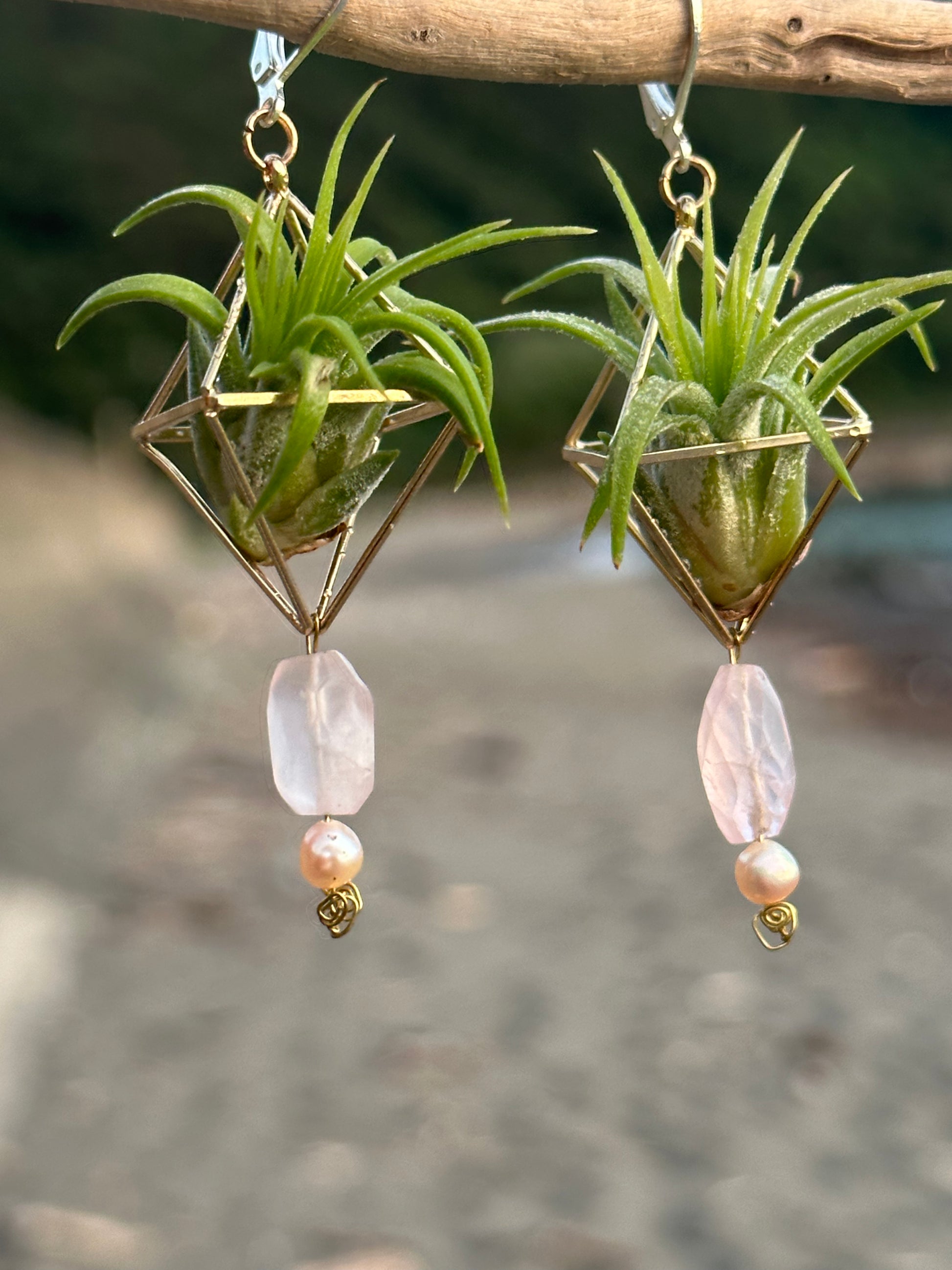 Rose Quartz Air Plant Earrings ~ Diamond Octahedron Earrings