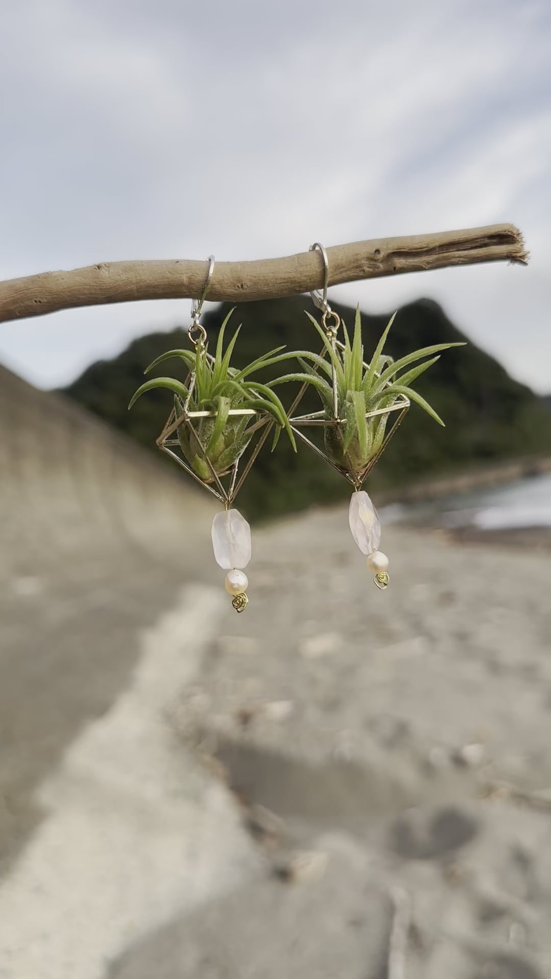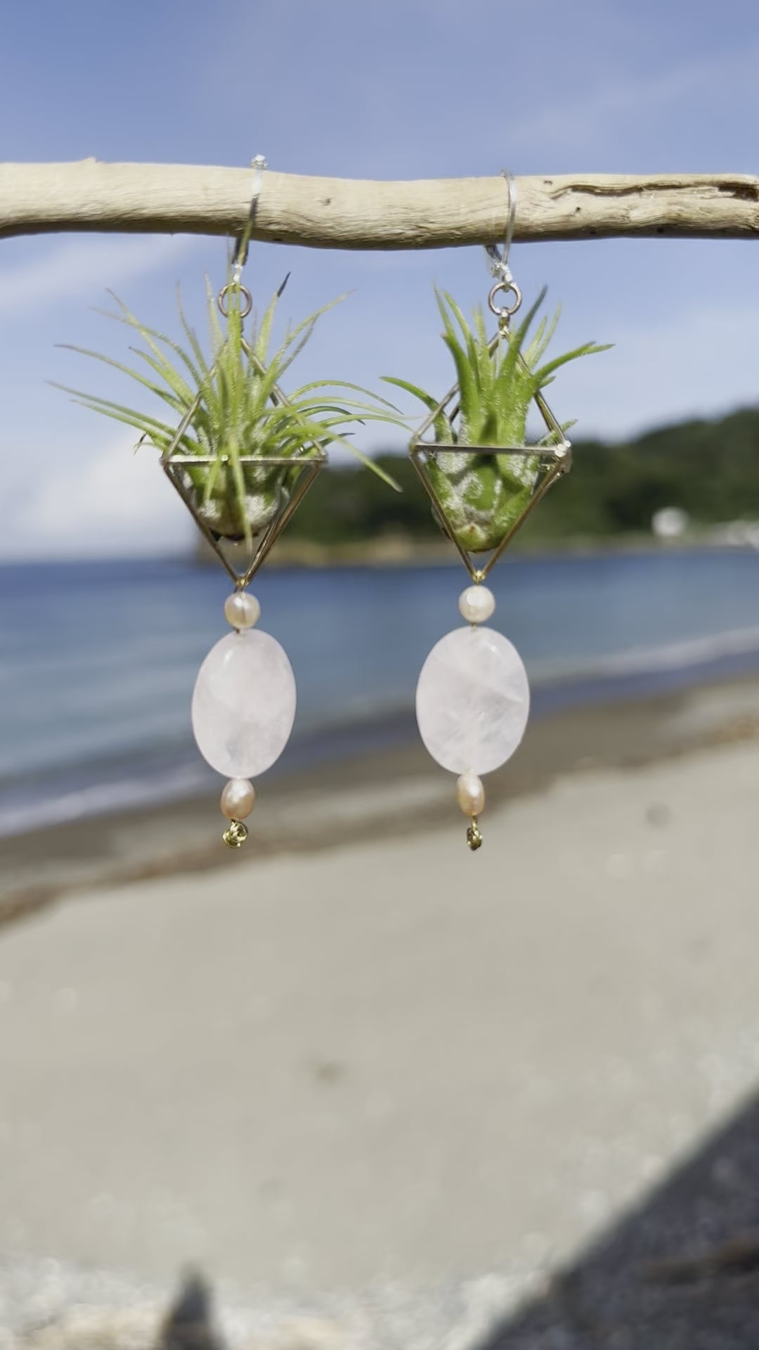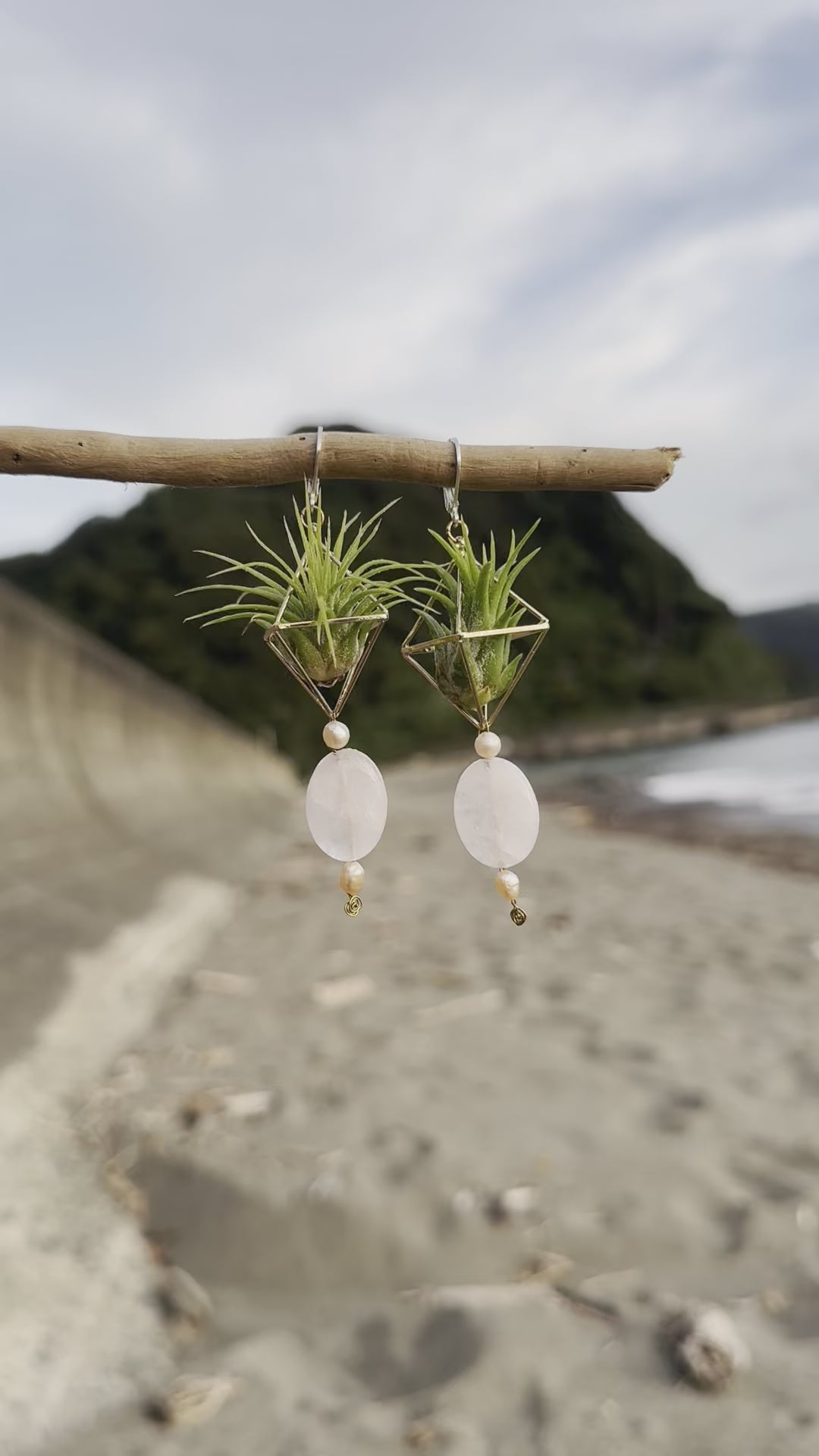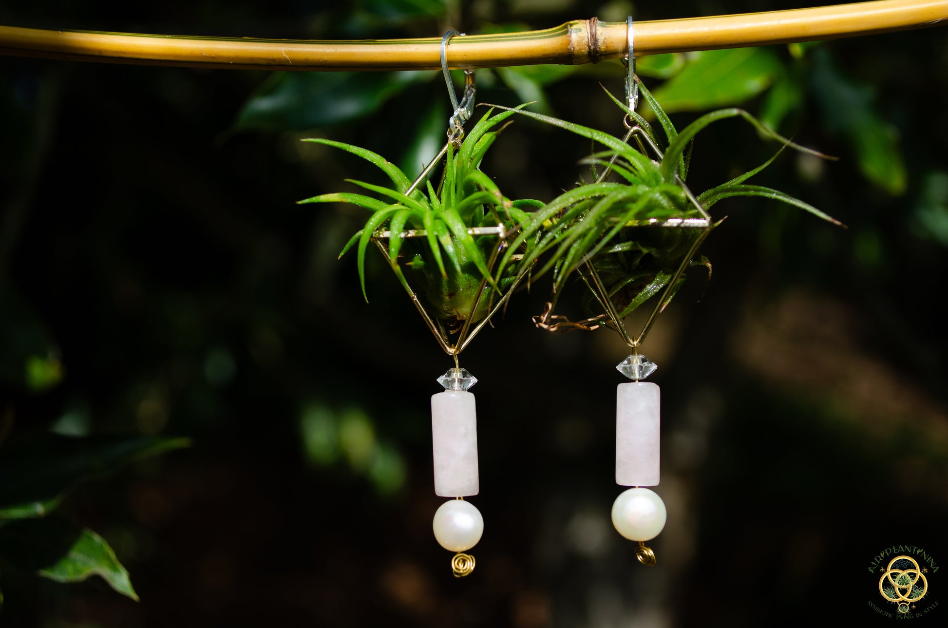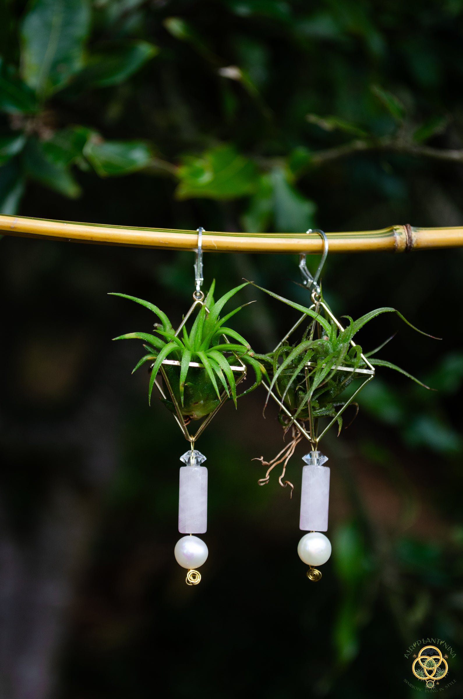 Adorned with a rose quartz and pearls, these elegant plant earrings are perfect for any occasion! Octahedron Geometric Temples cradle living Air Plants while they charge and meditate next to your face~ bringing you fresh air and great energy!