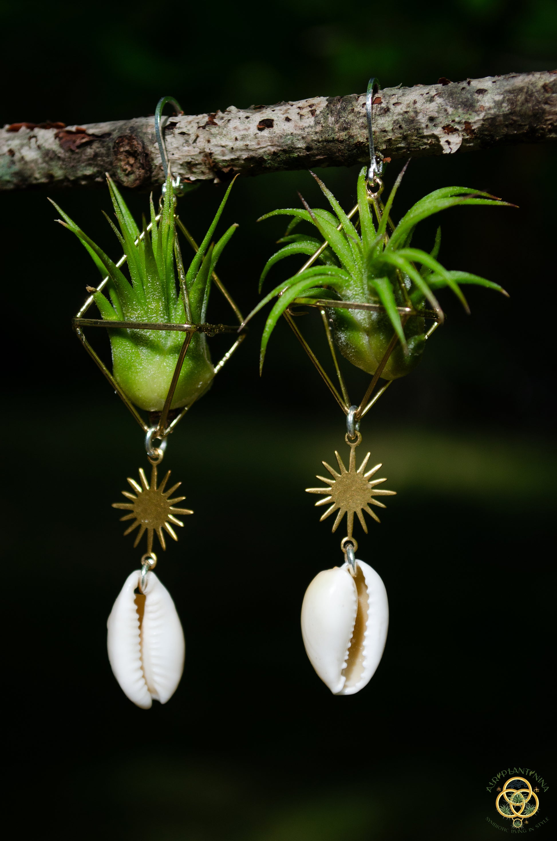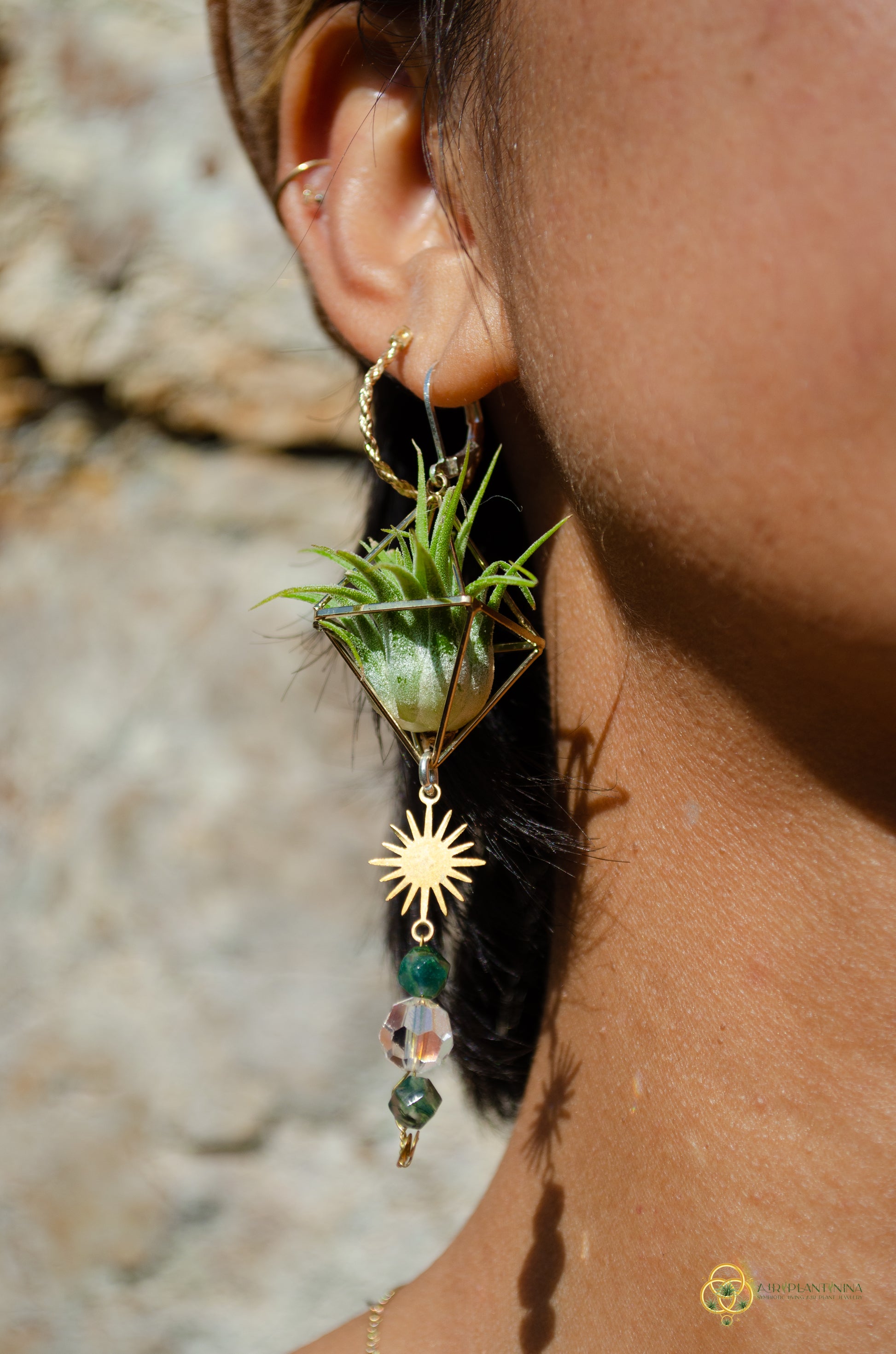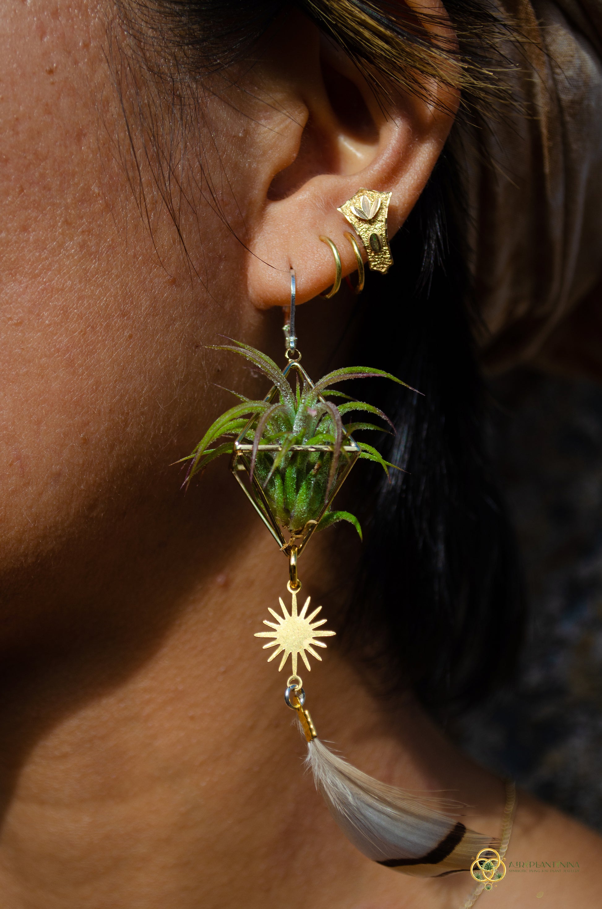 Adorned with a golden sun charm, feathers, or crystals, these cute, minimalist Air Plant earrings are perfect for any occasion! Sterling Silver Lever-back Earring Hooks Clips onto Everything including pendants, braids, and other earrings, AKA It's Multifunctional! Octahedron Geometric Temples cradle living Air Plants while they charge and meditate next to your face~ bringing you fresh air and great energy.